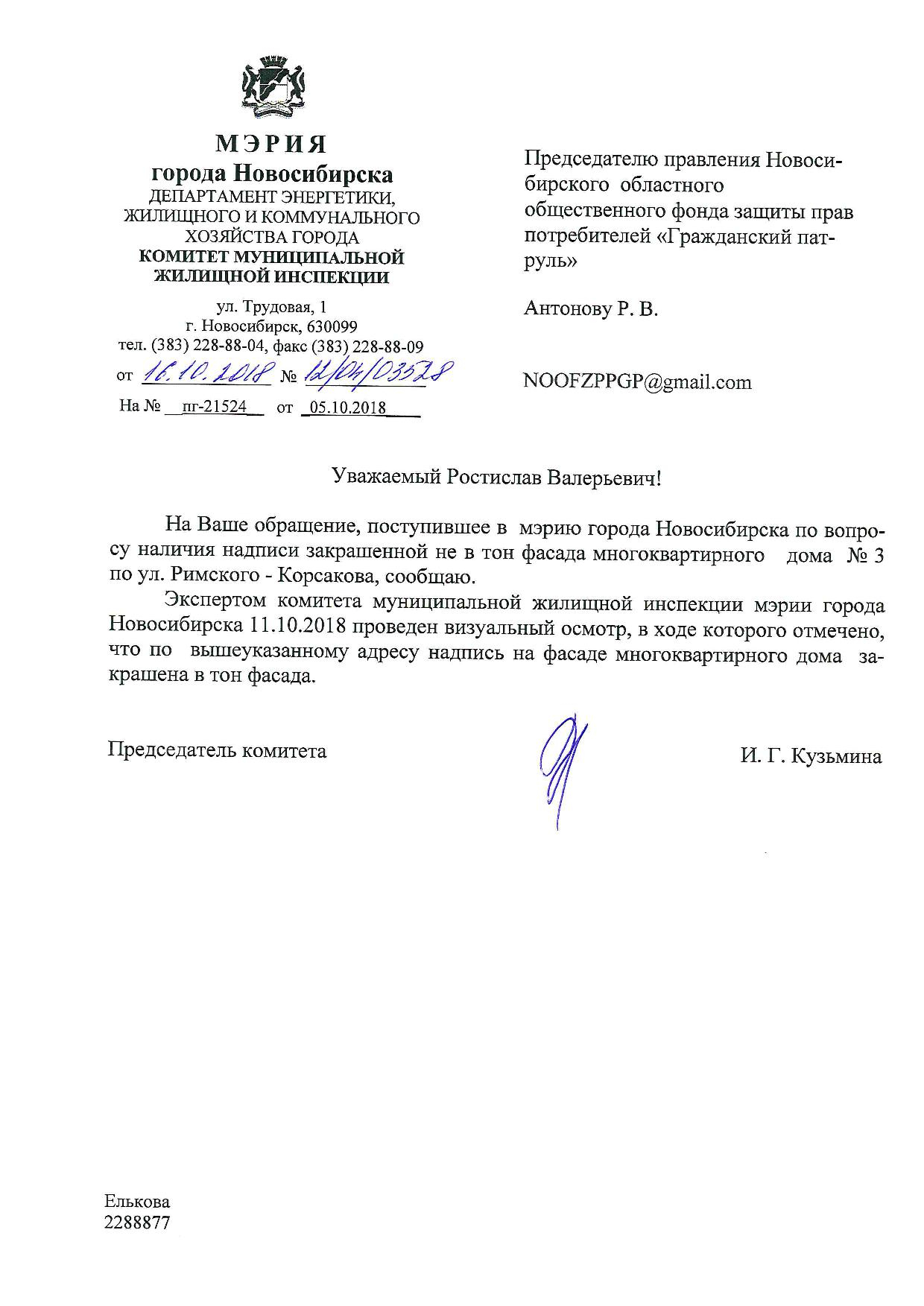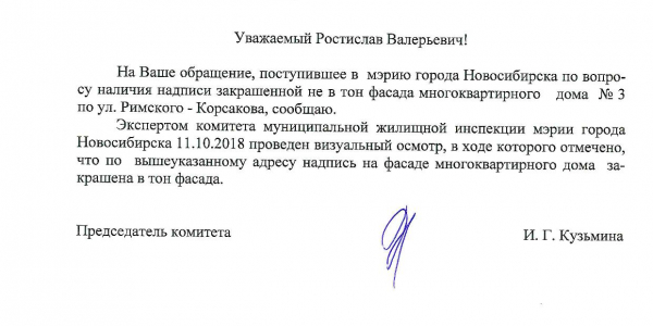 Номер жалобы:42218 Тип жалобы:Иные проблемы ЖКХ Название объекта:Управляющая Компания Регион:Новосибирская область Город:Новосибирск Адрес:ул. Римского-Корсакова, 3 Описание жалобы:Надписи на фасаде дома закрашены не в тон Статус: