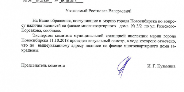 Номер жалобы:42214 Тип жалобы:Иные проблемы ЖКХ Название объекта:Управляющая Компания Регион:Новосибирская область Город:Новосибирск Адрес:ул. Римского-Корсакова, 3/2 Описание жалобы:Надписи на фасаде дома Статус:
