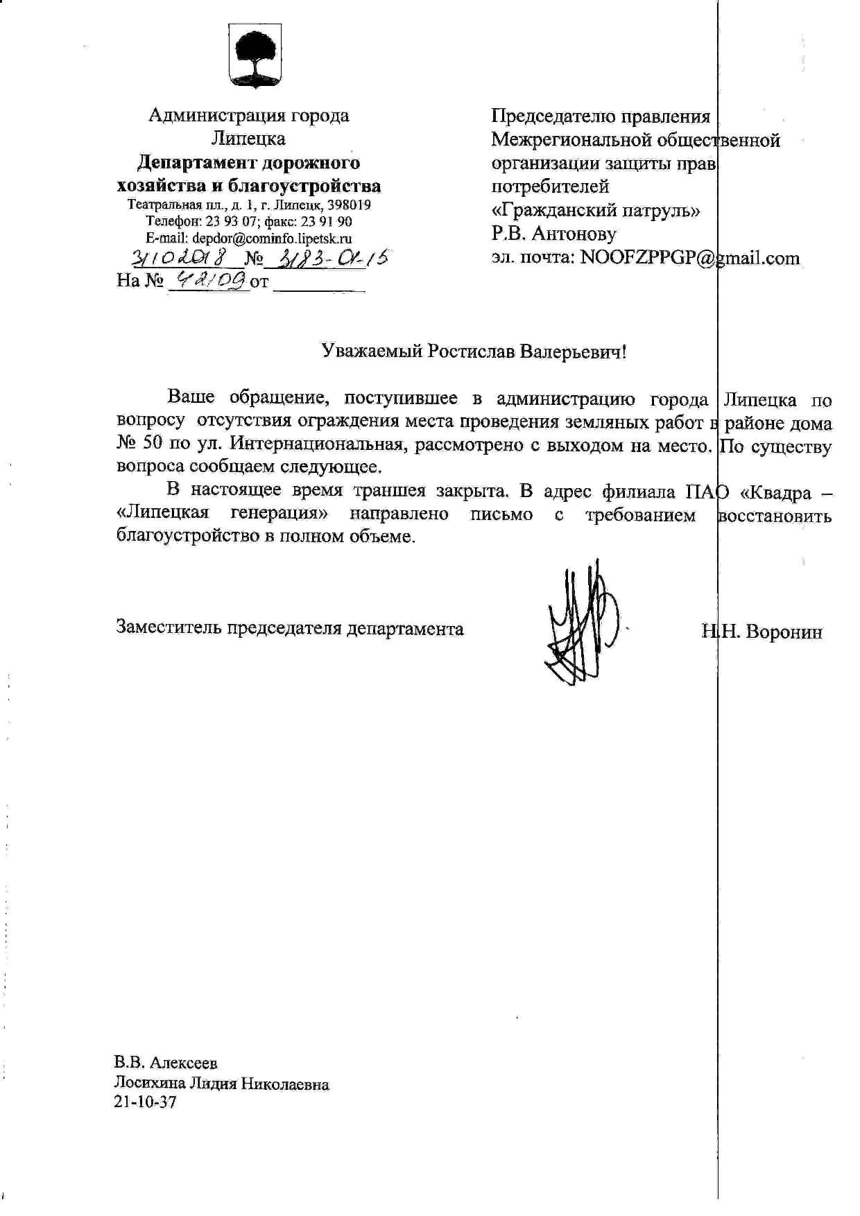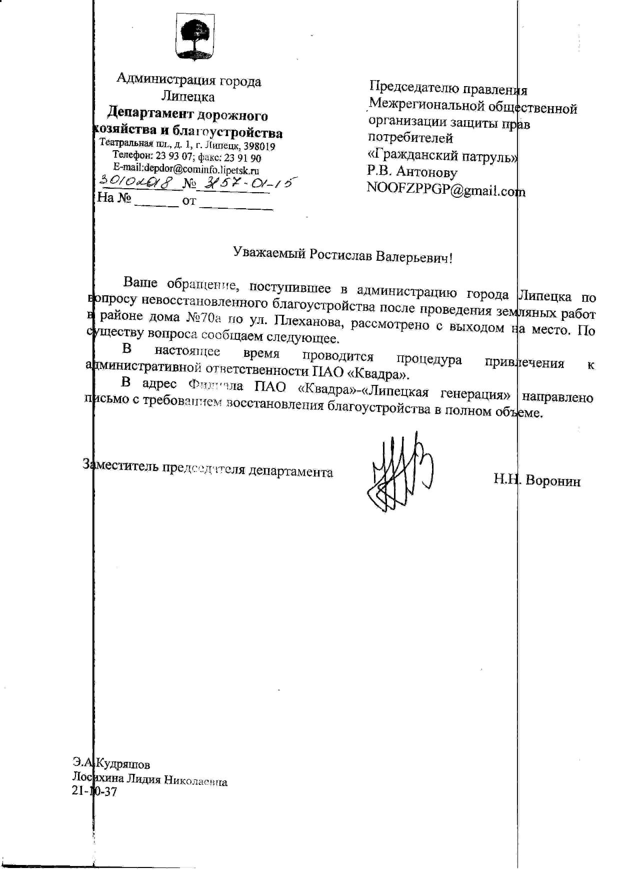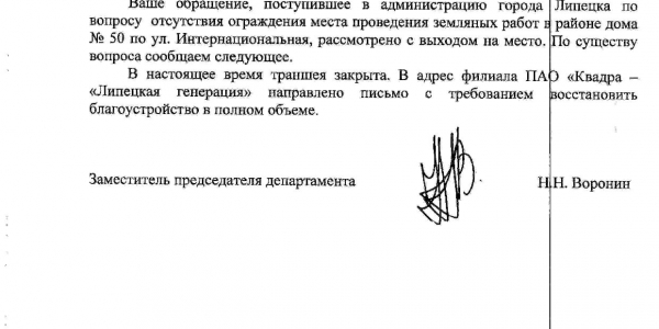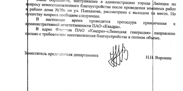 Номер жалобы:42114 Тип жалобы:Иные проблемы ЖКХ Название объекта:М Регион:Липецкая область Город:Липецк Адрес:ул. Плеханова, 70А Описание жалобы:Не благоустроили после ремонта сетей Статус: