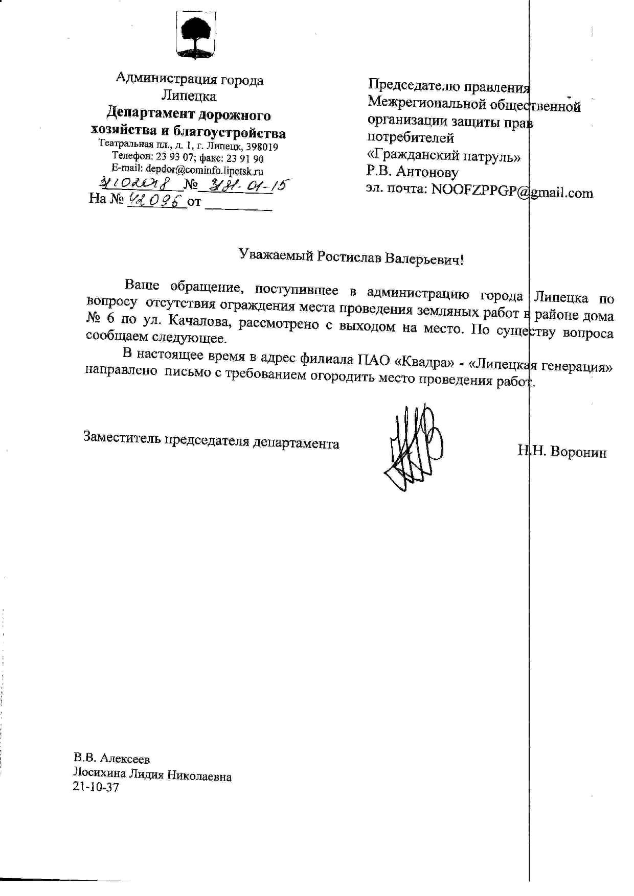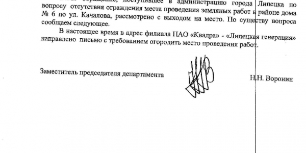 Номер жалобы:42096 Тип жалобы:Иные проблемы ЖКХ Название объекта:Мэрия Регион:Липецкая область Город:Липецк Адрес:Качалова ул., 6 Описание жалобы:Не огорожены земляные работы Статус: