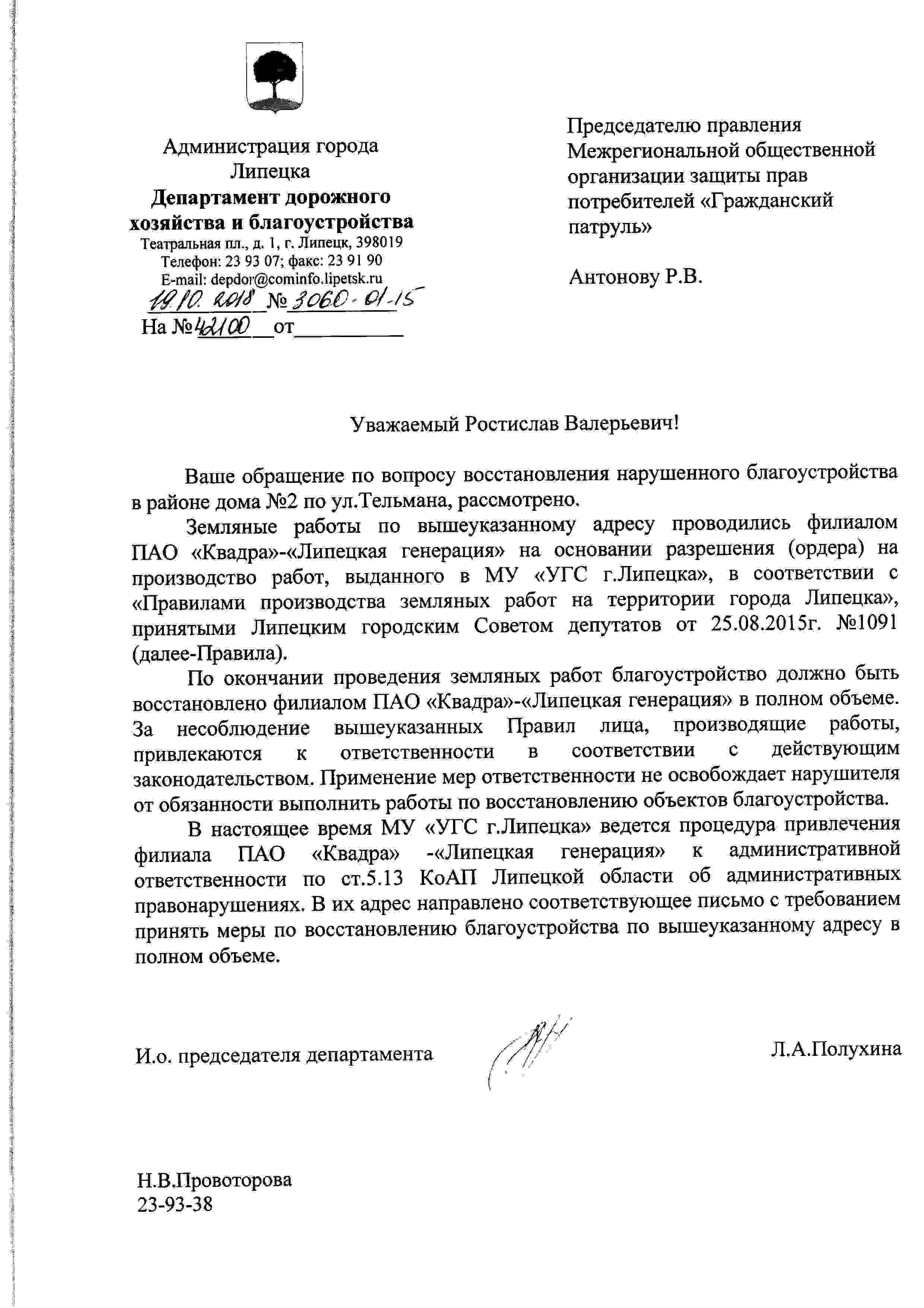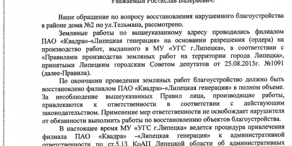 Номер жалобы:42100 Тип жалобы:Иные проблемы ЖКХ Название объекта:Сети Регион:Липецкая область Город:Липецк Адрес:ул. Тельмана, 2 Описание жалобы:Не проведено благоустройство территории после работ Статус: