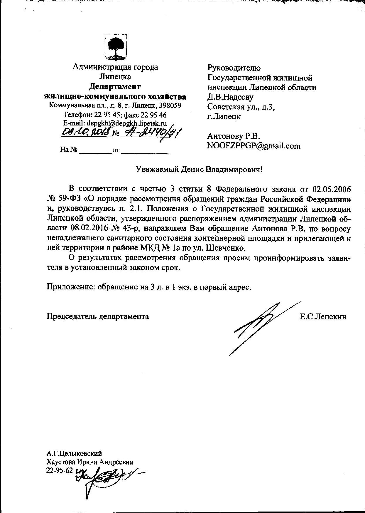Номер жалобы:42102 Тип жалобы:Иные проблемы ЖКХ Название объекта:Мэрия Регион:Липецкая область Город:Липецк Адрес:ул. Шевченко, 1а Описание жалобы:Не вывезен крупногабаритный мусор Статус: