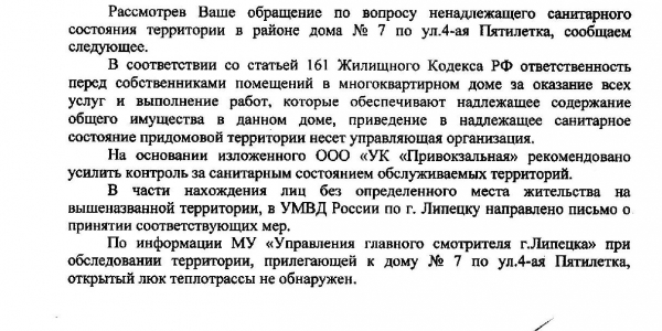 Номер жалобы:42105 Тип жалобы:Иные проблемы ЖКХ Название объекта:М Регион:Липецкая область Город:Липецк Адрес:4-ая Пятилеткa ул., 7 Описание жалобы:Бомжи, мусор, открытый люк теплотрассы Статус:
