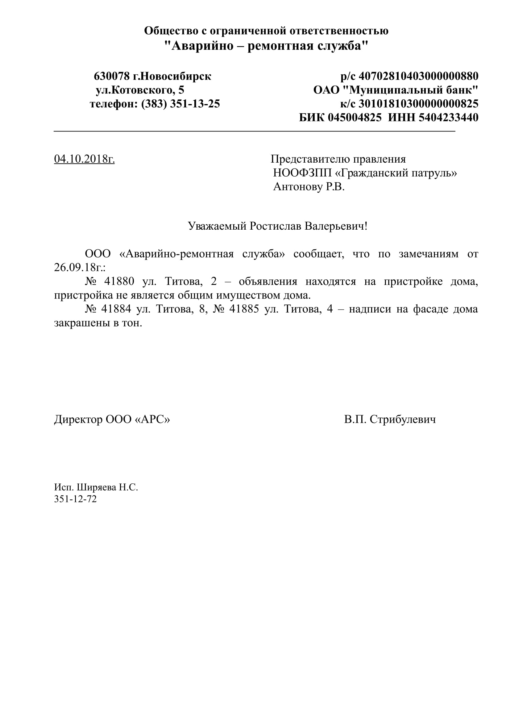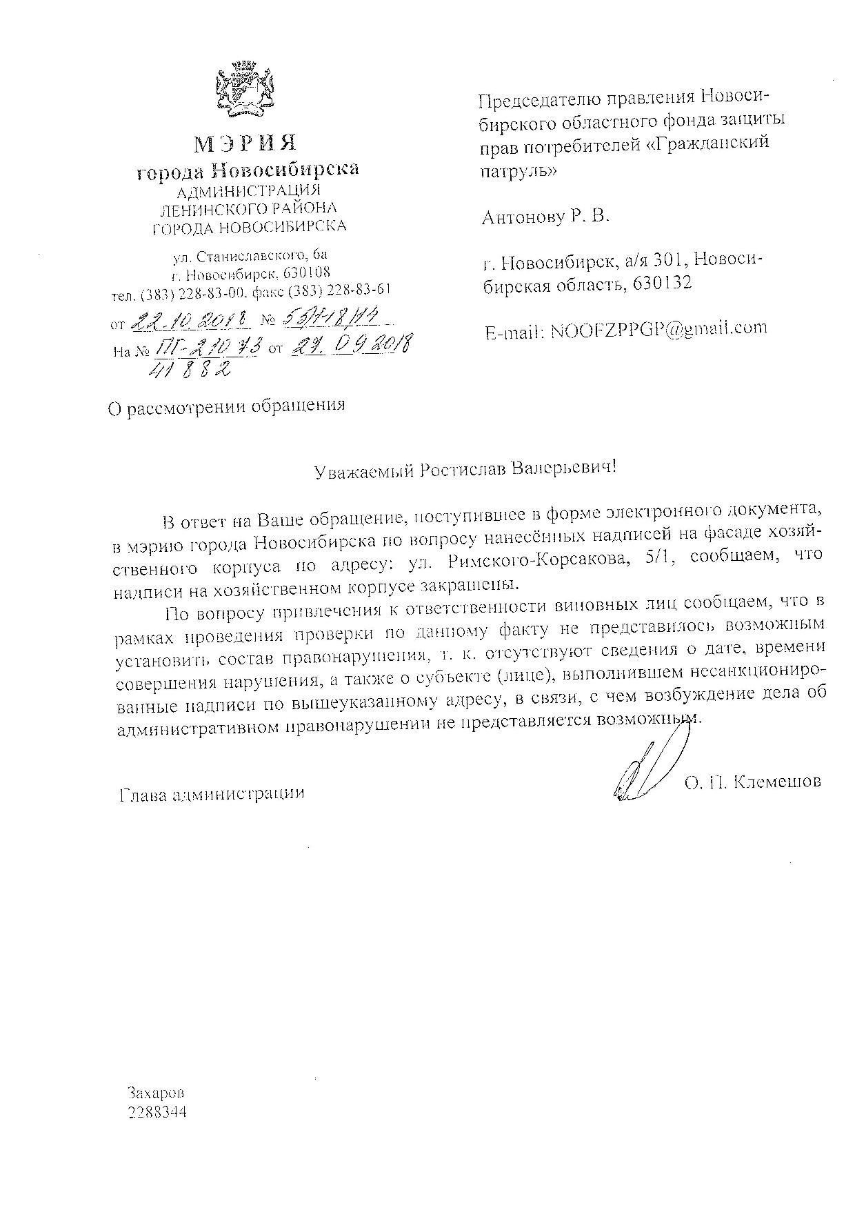 Номер жалобы:41882 Тип жалобы:Иные проблемы ЖКХ Название объекта:Управляющая Компания Регион:Новосибирская область Город:Новосибирск Адрес:ул. Римского-Корсакова, 5/1 Описание жалобы:Надписи на фасаде хоз корпуса Статус: