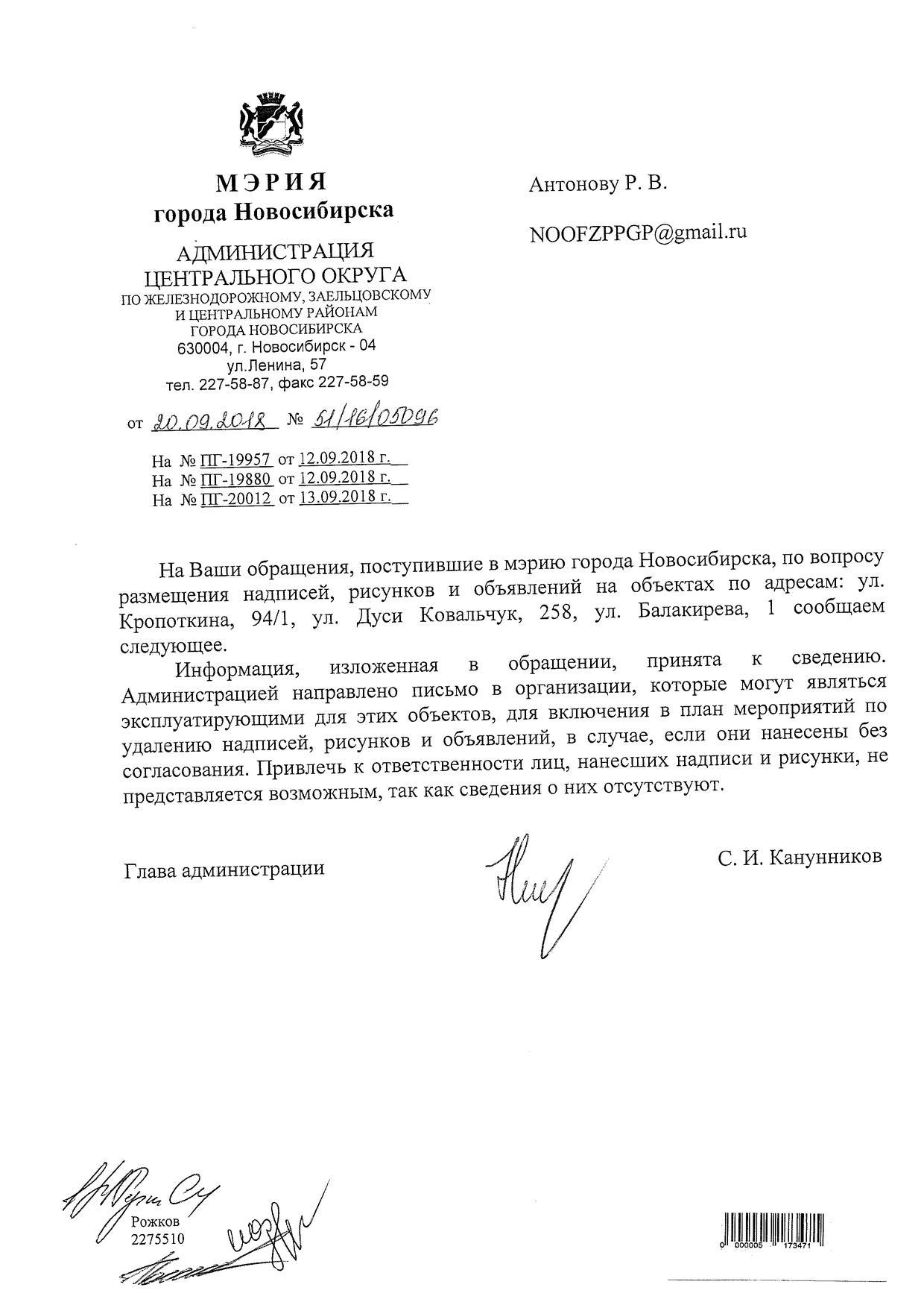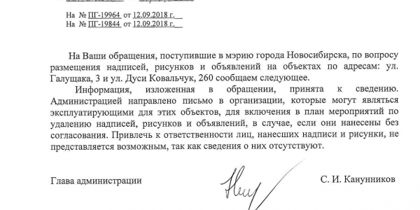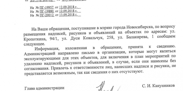 Номер жалобы:41342 Тип жалобы:Иные проблемы ЖКХ Название объекта:Управляющая Компания Регион:Новосибирская область Город:Новосибирск Адрес:ул. Балакирева, 1 Описание жалобы:Надписи на фасаде дома Статус: