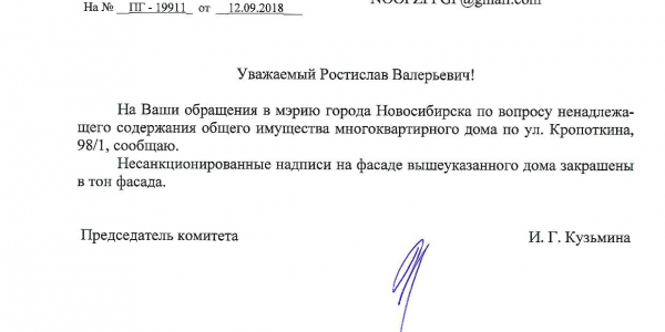 Номер жалобы:41173 Тип жалобы:Иные проблемы ЖКХ Название объекта:Управляющая Компания Регион:Новосибирская область Город:Новосибирск Адрес:ул. Кропоткина, 94/1 Описание жалобы:Надписи на хозяйственном корпусе Статус: