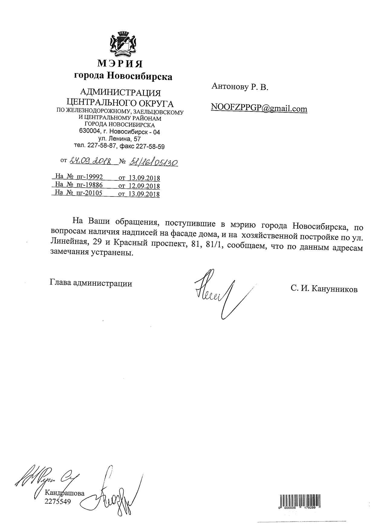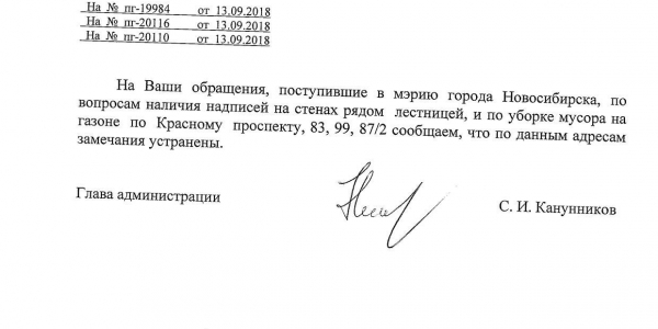Номер жалобы:41118 Тип жалобы:Иные проблемы ЖКХ Название объекта:Управляющая Компания Регион:Новосибирская область Город:Новосибирск Адрес:Красный пр., 81 Описание жалобы:Надписи на фасаде дома Статус: