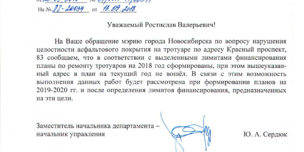 Номер жалобы:41119 Тип жалобы:Иные проблемы ЖКХ Название объекта:Управляющая Компания Регион:Новосибирская область Город:Новосибирск Адрес:Красный пр., 83 Описание жалобы:Яма на тротуаре перед домом Статус: