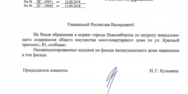 Номер жалобы:41121 Тип жалобы:Иные проблемы ЖКХ Название объекта:Управляющая Компания Регион:Новосибирская область Город:Новосибирск Адрес:Красный пр., 85 Описание жалобы:Надписи на фасаде дома Статус:
