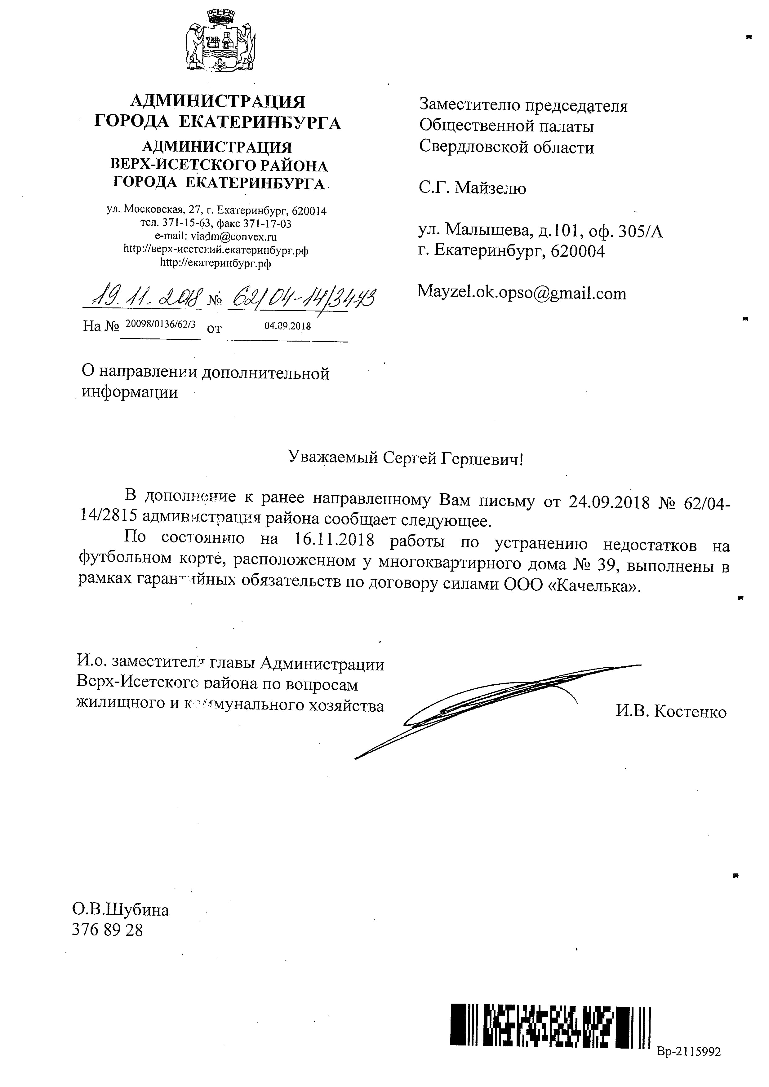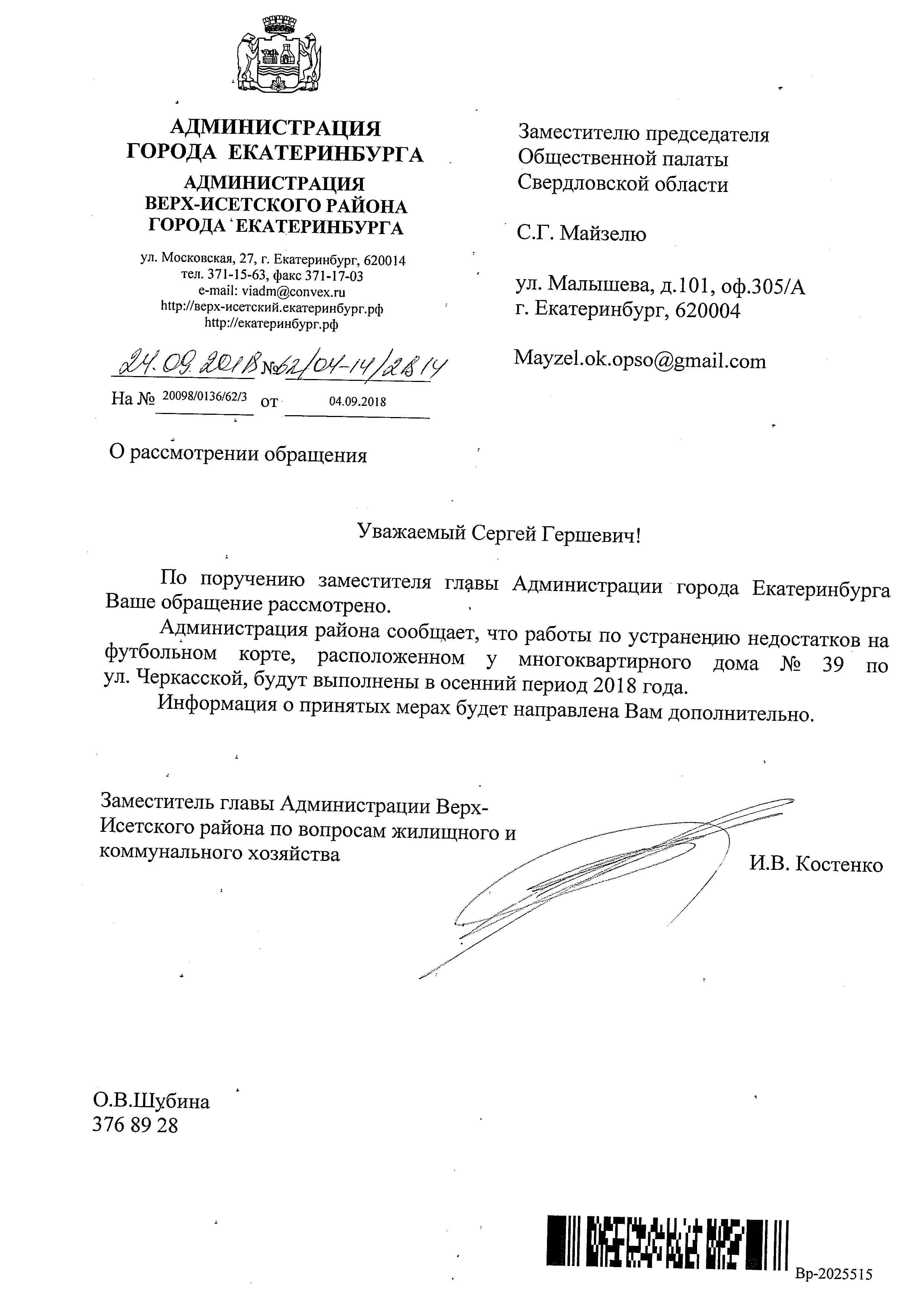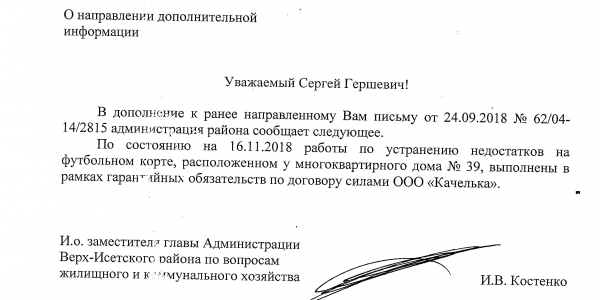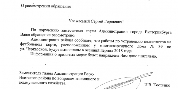 Номер жалобы:41001 Тип жалобы:Иные проблемы ЖКХ Название объекта:Ооо Ук Дом-сервис Регион:Свердловская область Город:Екатеринбург Адрес:Черкасская ул., 39 Описание жалобы:Футбольный корт разваливается, несмотря на то, что он на гарантии. Отсутствуют крепежи сетки к столбикам. По жалобе в УК корт был закрыт на неделю, однако нарушения не были устранены. Статус: