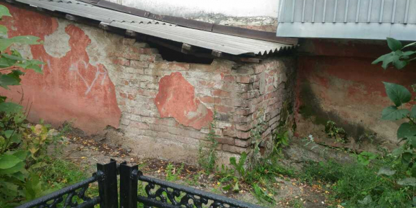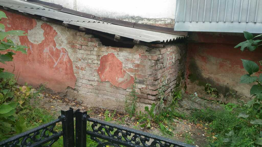 фундамент виден местами до кирпичей и покрылся мхом, штукатурка обсыпалась или ее вымыло дождями;