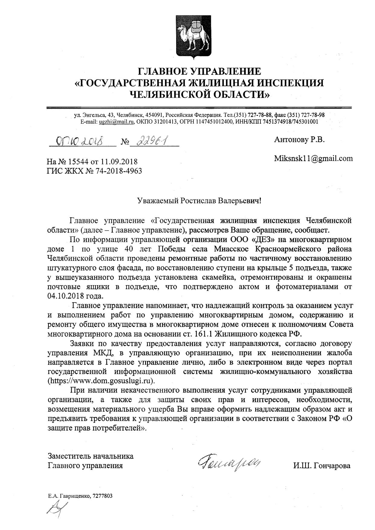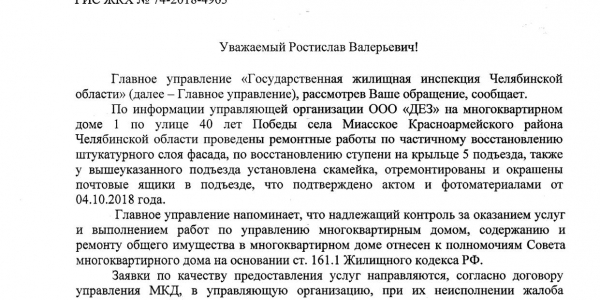 Номер жалобы:41077 Тип жалобы:Иные проблемы ЖКХ Название объекта:Администрация Красноармейского Муниципального Района Челябинской Области Регион:Челябинская Город:Миасское Адрес:40 Лет Победы ул., 1 Описание жалобы:Дом по ул. 40 лет Победы 1 находится в неудовлетворительном состоянии, а именно: