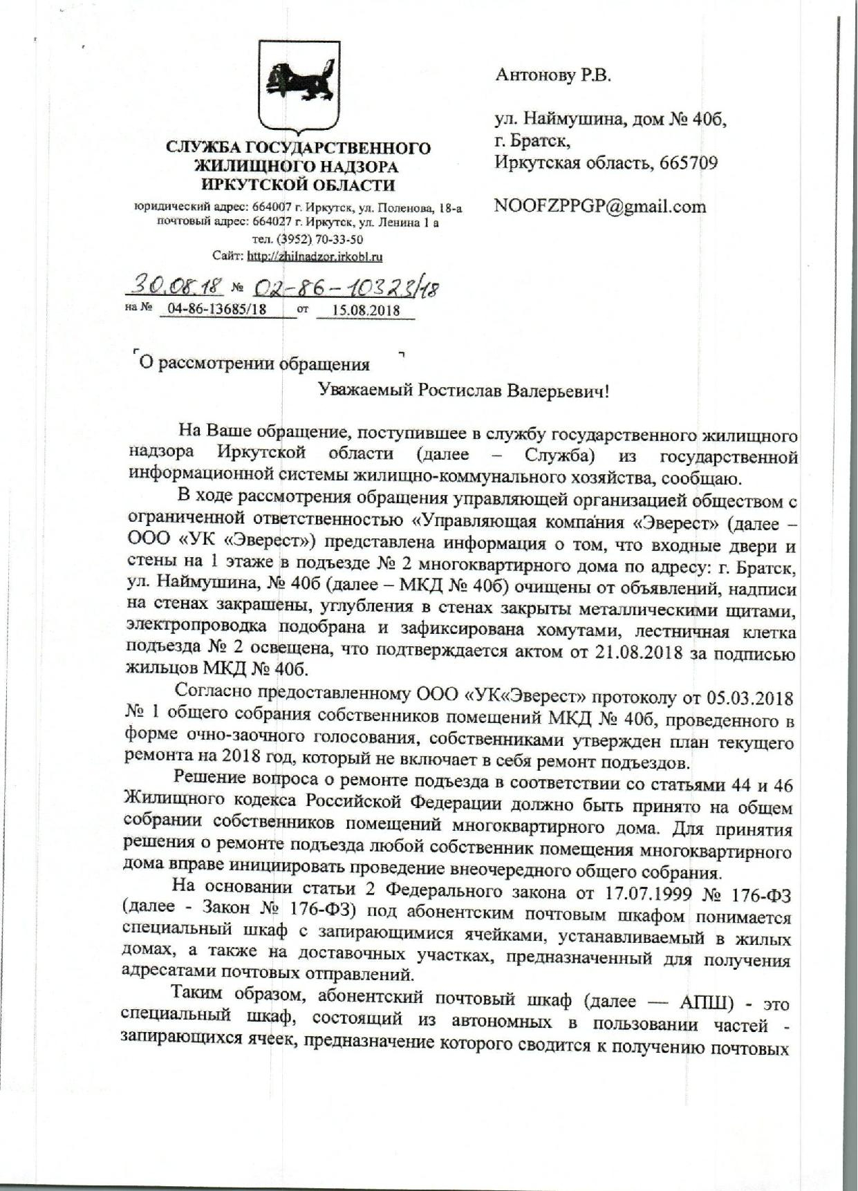 Номер жалобы:40799 Тип жалобы:Иные проблемы ЖКХ Название объекта: Регион:Иркутская область Город:Братск Адрес:Наймушина 40б Описание жалобы:После обращения в Гражданский патруль надписи на стенах во втором подъезде дома замазали вот таким способом. При этом не восстановили побелку у лифта на первом этаже. Около лифта также отваливается штукатурка. Поломанные почтовые ящики. На светильниках нет плафонов. Статус: