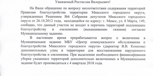 Номер жалобы:40851 Тип жалобы:Иные проблемы ЖКХ Название объекта:Администрация МГО Регион:Челябинская область Город:Миасс Адрес:ул. 8 Марта, 149 Описание жалобы:Не убираются заросли кустарников и травы, портится внешний вид города. Статус: