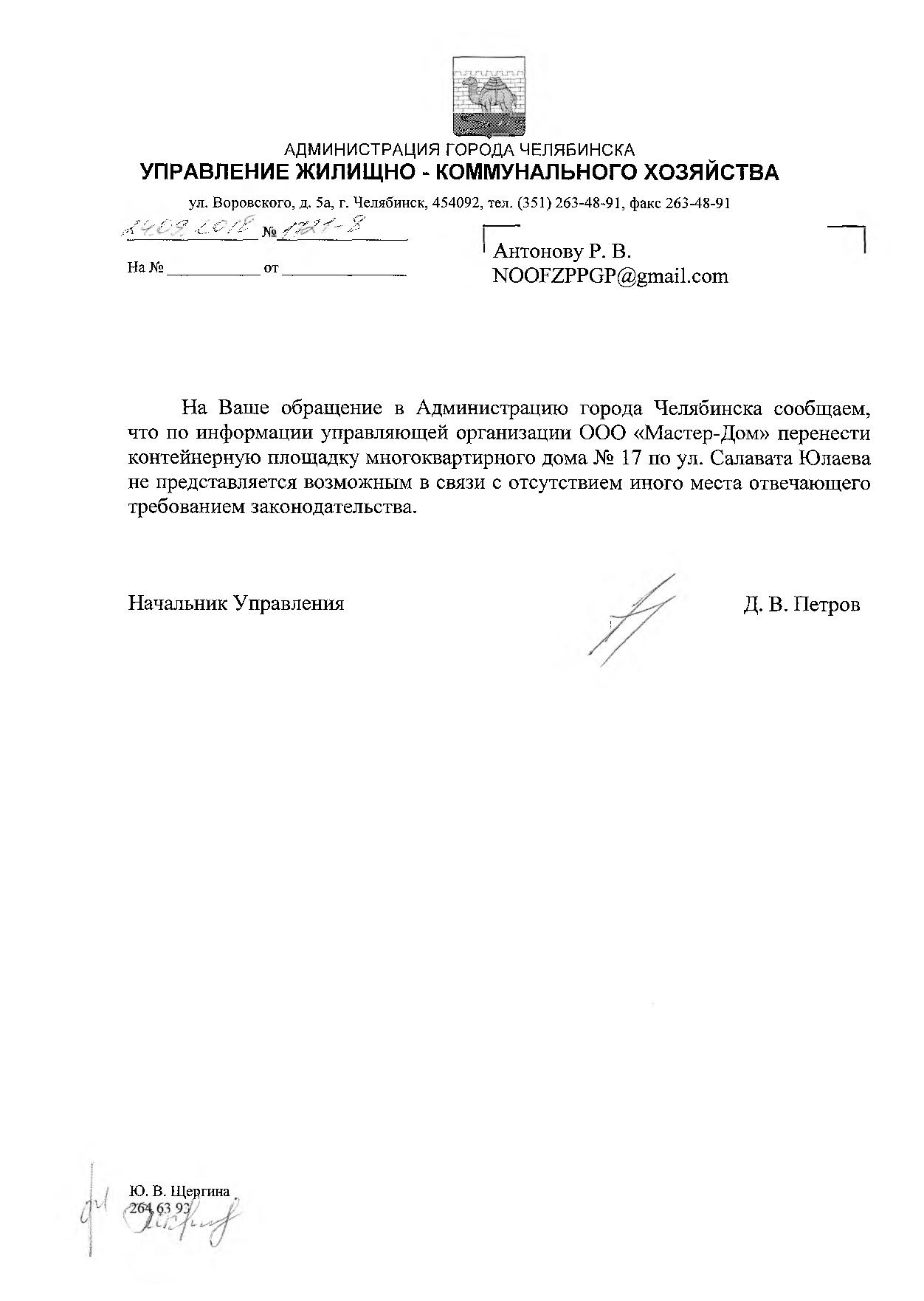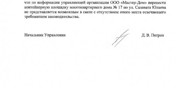 Номер жалобы:40648 Тип жалобы:Иные проблемы ЖКХ Название объекта:Не Знаю Город:Челябинск Адрес:Челябинск, улица Салавата Юлаева, 17a Описание жалобы:Вывоз мусора со двора дома 17 по улице Салавата Юлаева происходит с каждодневным «испытанием» для водителя мусоровоза. Подъезд к площадке с склонными баками проходит по узкому проезду, который заставлен по большей части брошенными автомобилями (за 3 года они не сдвигались с мест ни разу). Часть автомобилей паркуются там на длительное время жителями соседних домов. Все они мешают а иногда делают совершенно невозможным проезд к мусорке. Водителю мусоровоза приходится долго маневрировать между автомобилей задним ходом, а иногда и катать баки почти за 20 метров. Прошу решить вопрос вывоза мусора из нашего двора переносом площадки для контейнеров на другую сторону от двора (как раз имеется место, на котором долго стоял огромный мусорный контейнер, а недавно он был увезён, людям было удобно им пользоваться. Статус: