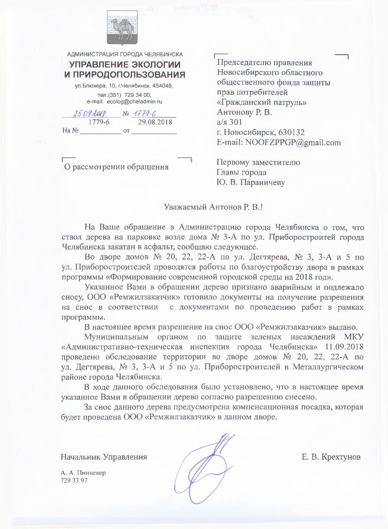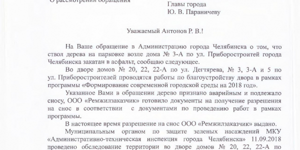 Номер жалобы:40662 Тип жалобы:Иные проблемы ЖКХ Название объекта:Администрация Город:Челябинск Адрес:Челябинск, улица Приборостроителей, 3А Описание жалобы:Во время ремонта двора дома по адресу улица Приборостроителей, 3А ствол дерева на парковке закатали в асфальт.