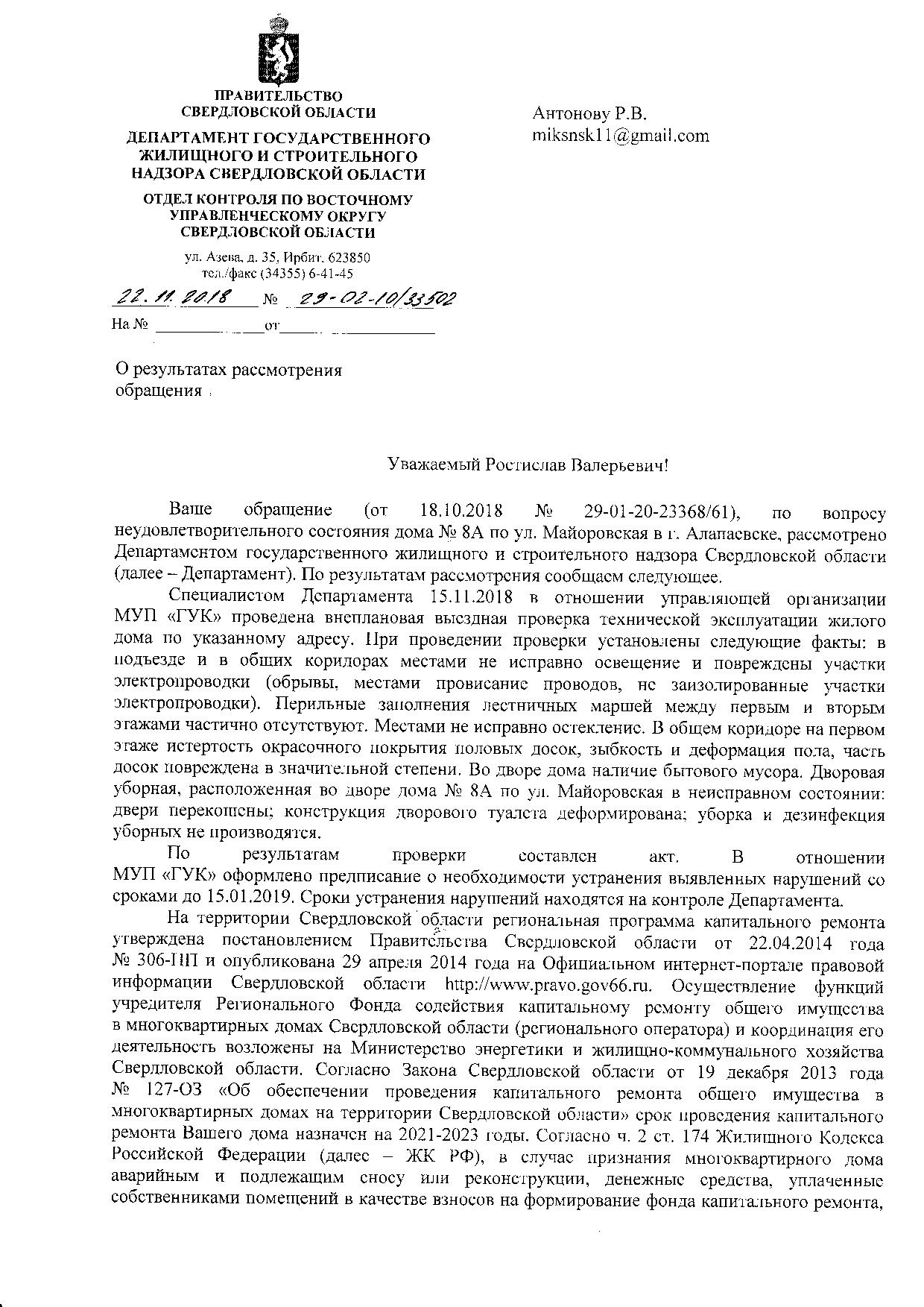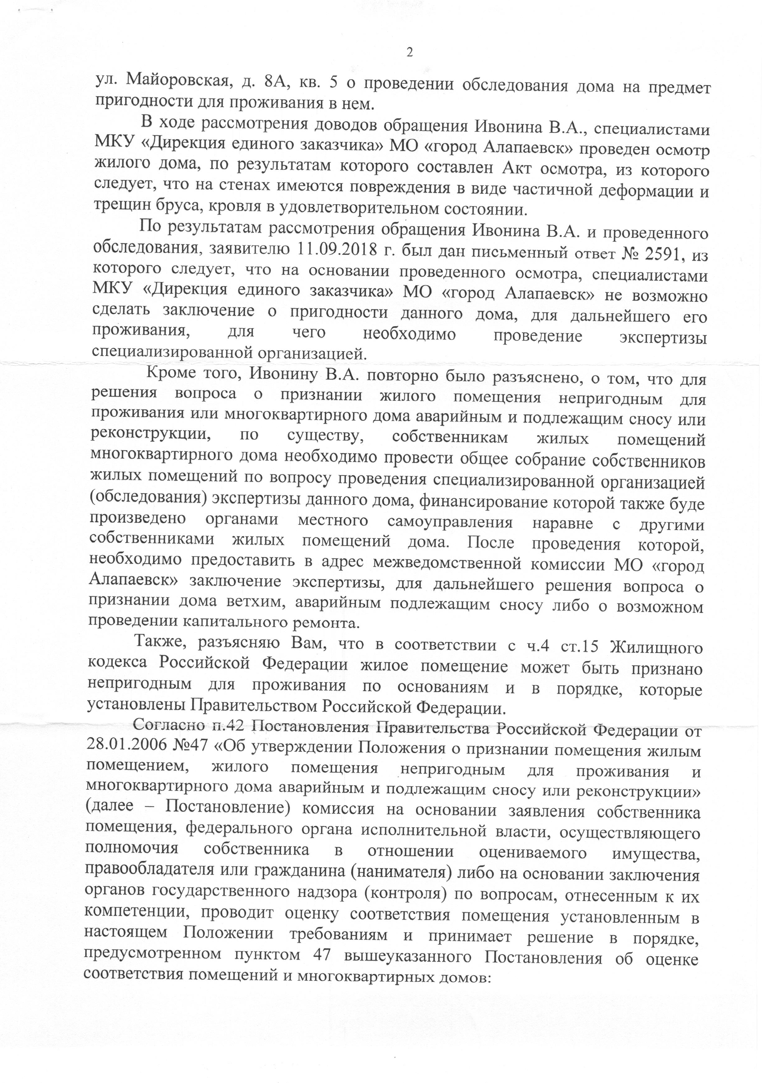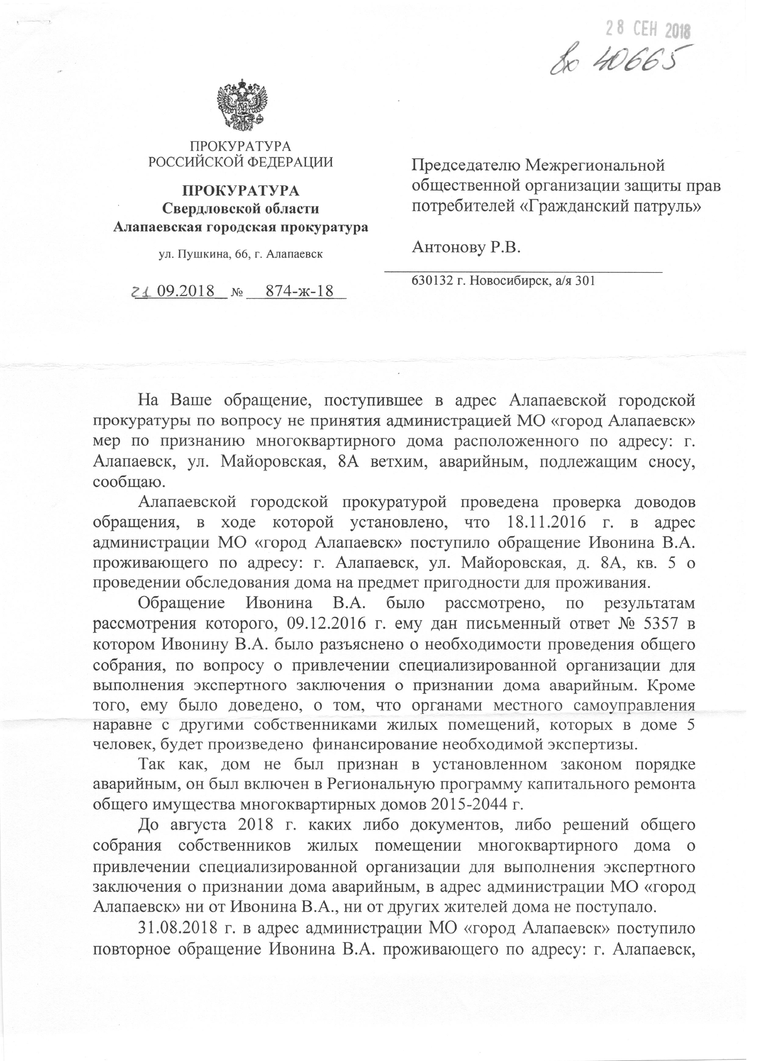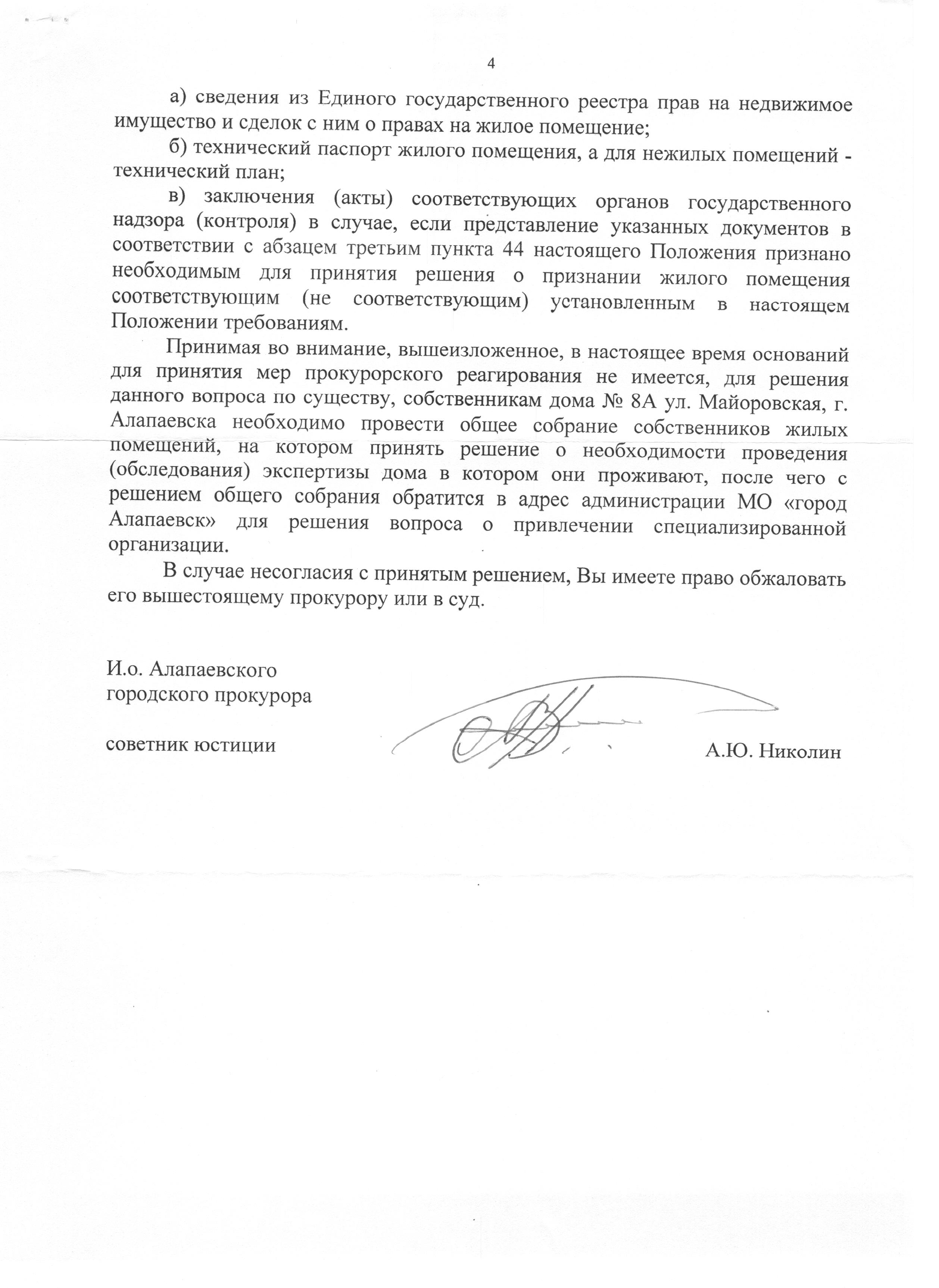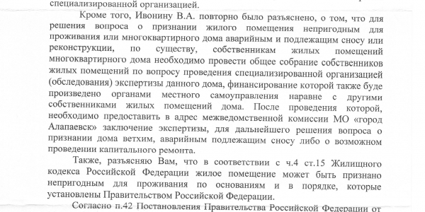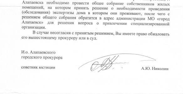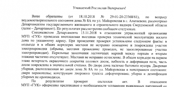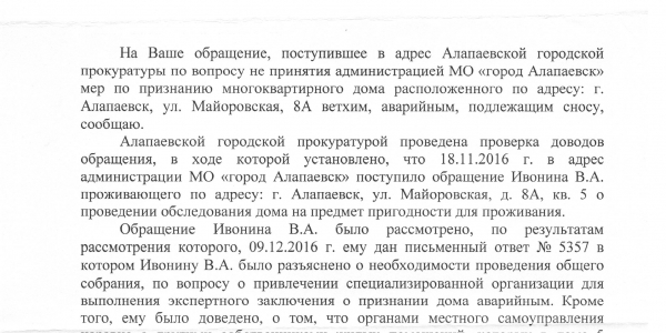 Номер жалобы:40665 Тип жалобы:Иные проблемы ЖКХ Название объекта: Регион:Свердловская область Город:Алапаевск Адрес:майоровская дом 8 А Описание жалобы:Скажите пожалуйста, как можно жить в таком доме, где падает штукатурка, падают стены, проваливается пол и никто за этим не следит, и никому ничего не нужно. Как жить людям? Дом в программу аварийного жилья не входит, сносить и расселять семьи никто не хочет. Видимо слишком затратно. Наверно начнут что-либо делать, когда совсем всё будет очень плохо или пострадают люди!? Статус: