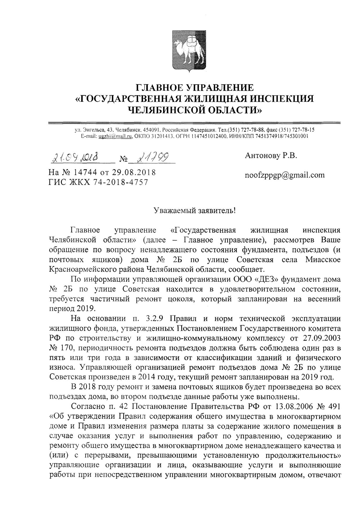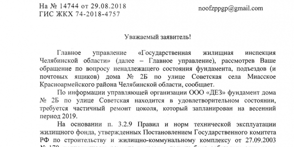 Номер жалобы:40704 Тип жалобы:Иные проблемы ЖКХ Название объекта:УК "ДЕЗ" с. Миасское Красноармейский Район Челябинской Области Регион:Челябинская область Город:Миасское Адрес:ул. Советская, 2б Описание жалобы:Вид фундамента дома 2б, по ул. Советской, выглядит недолжным образом. Статья "обслуживание и ремонт многоквартирного дома" вызывает вопросы, на что идут средства в течении многих лет , при таком внешнем виде дома. Не известно что происходит в подъездах дома и в каком состоянии почтовые ящики.