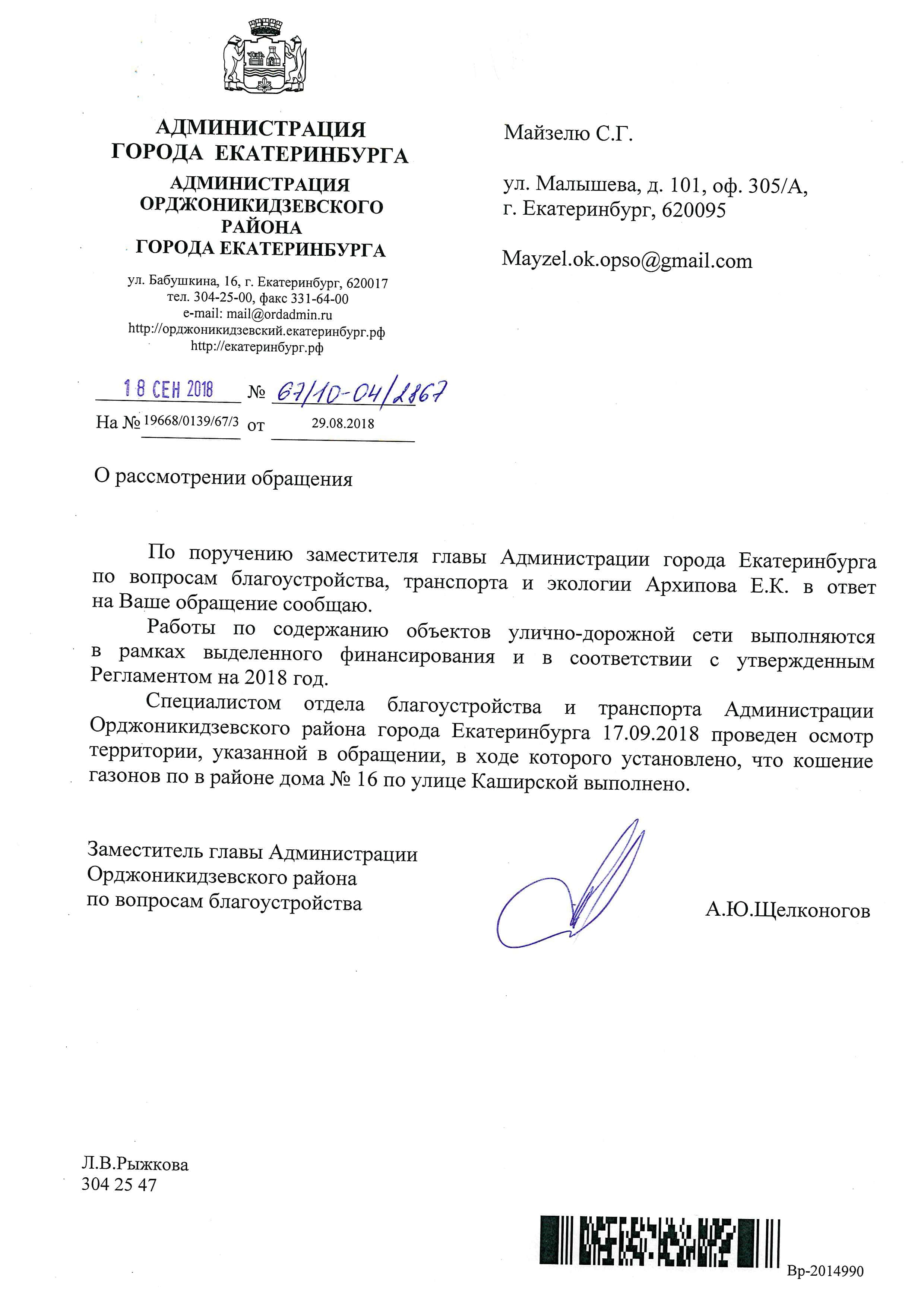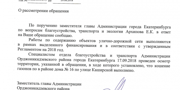 Номер жалобы:40751 Тип жалобы:Иные проблемы ЖКХ Название объекта:Коробова С.О. Регион:Свердловская область Город:Екатеринбург Адрес:Каширская ул., 16 Описание жалобы:Добрый день опять нескошена трава. И хотя ответ опять от администрации будет , что она момент осмотра была скошена. Значит надо писать. СПАСИБО Статус: