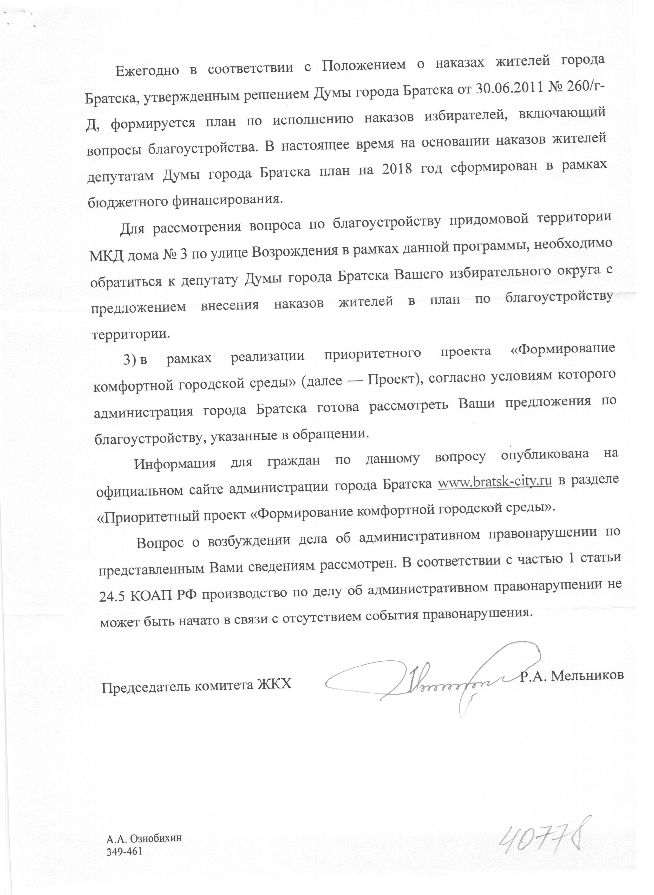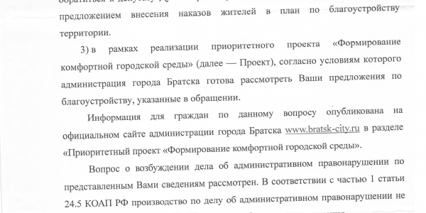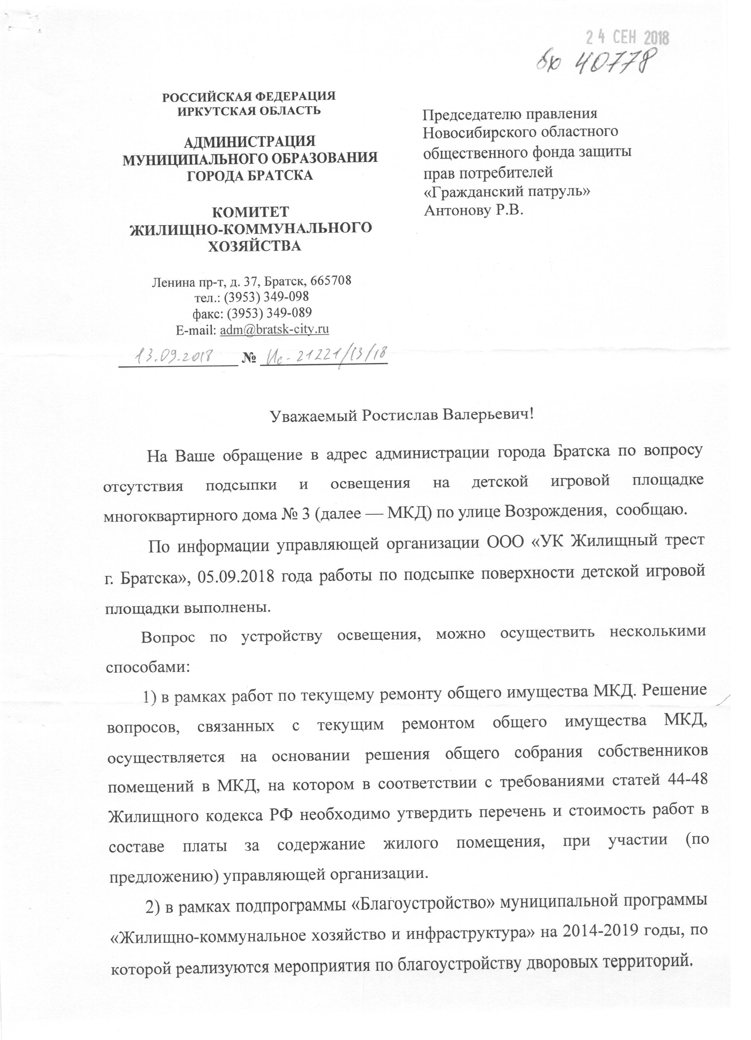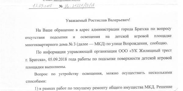 Номер жалобы:40778 Тип жалобы:Иные проблемы ЖКХ Название объекта:Жилтрест Регион:Иркутская область Город:Братск Адрес:улица Возрождения, 3 Описание жалобы:На детской площадке нет подсыпки и освещения Статус: