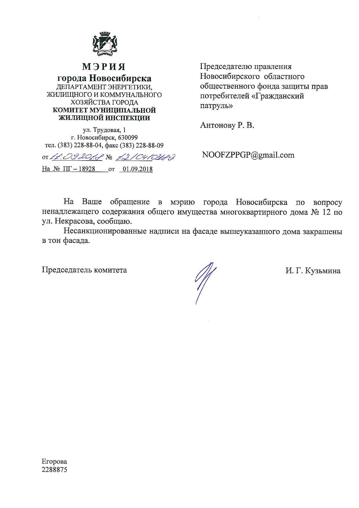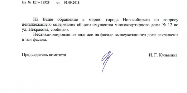 Номер жалобы:40513 Тип жалобы:Иные проблемы ЖКХ Название объекта:Управляющая Компания Регион:Новосибирская область Город:Новосибирск Адрес:ул. Некрасова, 4 Описание жалобы:Надписи на фасаде дома Статус: