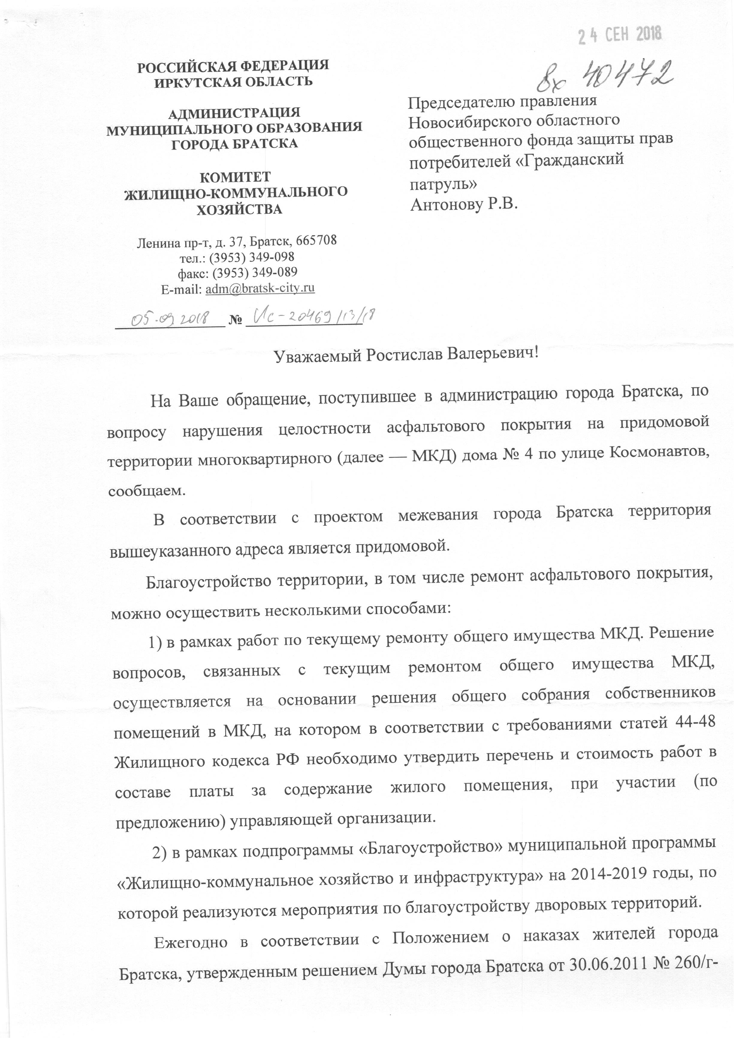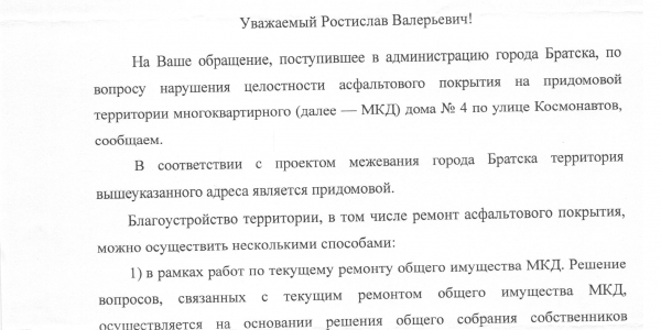 Номер жалобы:40472 Тип жалобы:Иные проблемы ЖКХ Название объекта:Дыра Огороженая Регион:Иркутская область Город:Братск Адрес:б-р Космонавтов, 4 Описание жалобы:По адресу: Иркутская область, г.Братск, бульвар Космонавтов, 4 расположен огороженная но не отремонтированная дыра в асвальте. Статус: