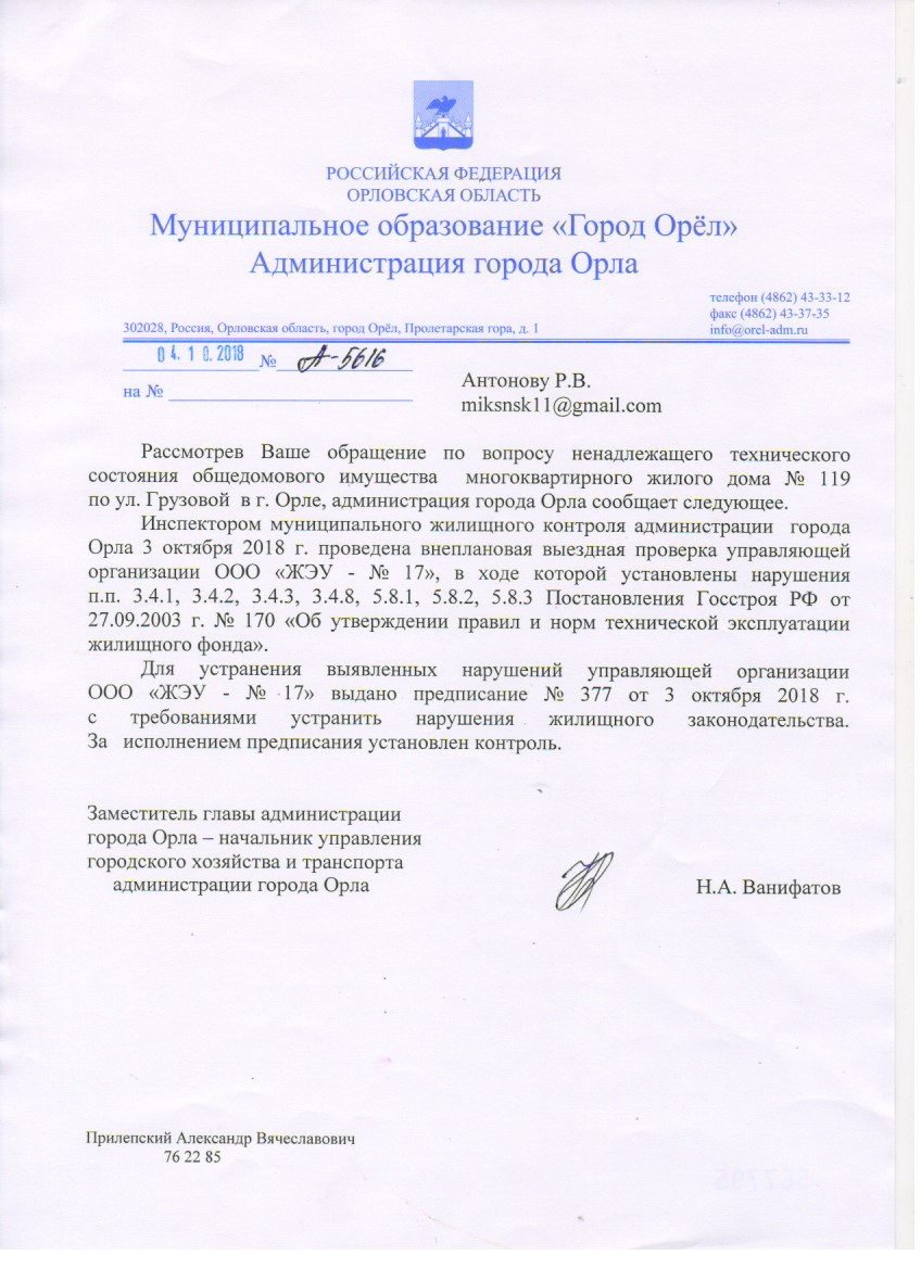 Номер жалобы:40473 Тип жалобы:Иные проблемы ЖКХ Название объекта:ЗАО ЖРЭУ 3, ПГУК, ЖЭУ 17 Регион:Орловская область Город:Орёл Адрес:ул. Грузовая, 119 Описание жалобы:Из подвала дома 119 постоянный очень сильный запах канализации. В квартирах на первом этаже скапливаются все эти испарения, сильный запах и в подъезде. Жить в постоянном запахе канализации не только некомфортно, но и небезопасно! Дверь в подвал постоянно открыта, любой желающий имеет доступ к нему. Скорее всего, превышен уровень метана, что является взрывоопасной ситуацией! Управляющие компании почему-то не могут решить проблему, которая длится не первый год. Замените сгнившие трубы в подвале! Статус: