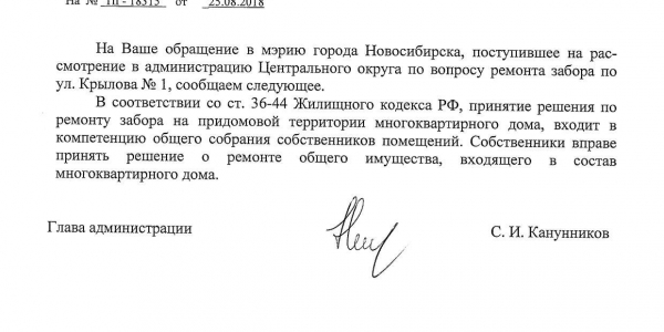 Номер жалобы:40375 Тип жалобы:Иные проблемы ЖКХ Название объекта:Управляющая Компания Регион:Новосибирская область Город:Новосибирск Адрес:ул. Крылова, 1 Описание жалобы:Сломанный забор во дворе дома Статус: