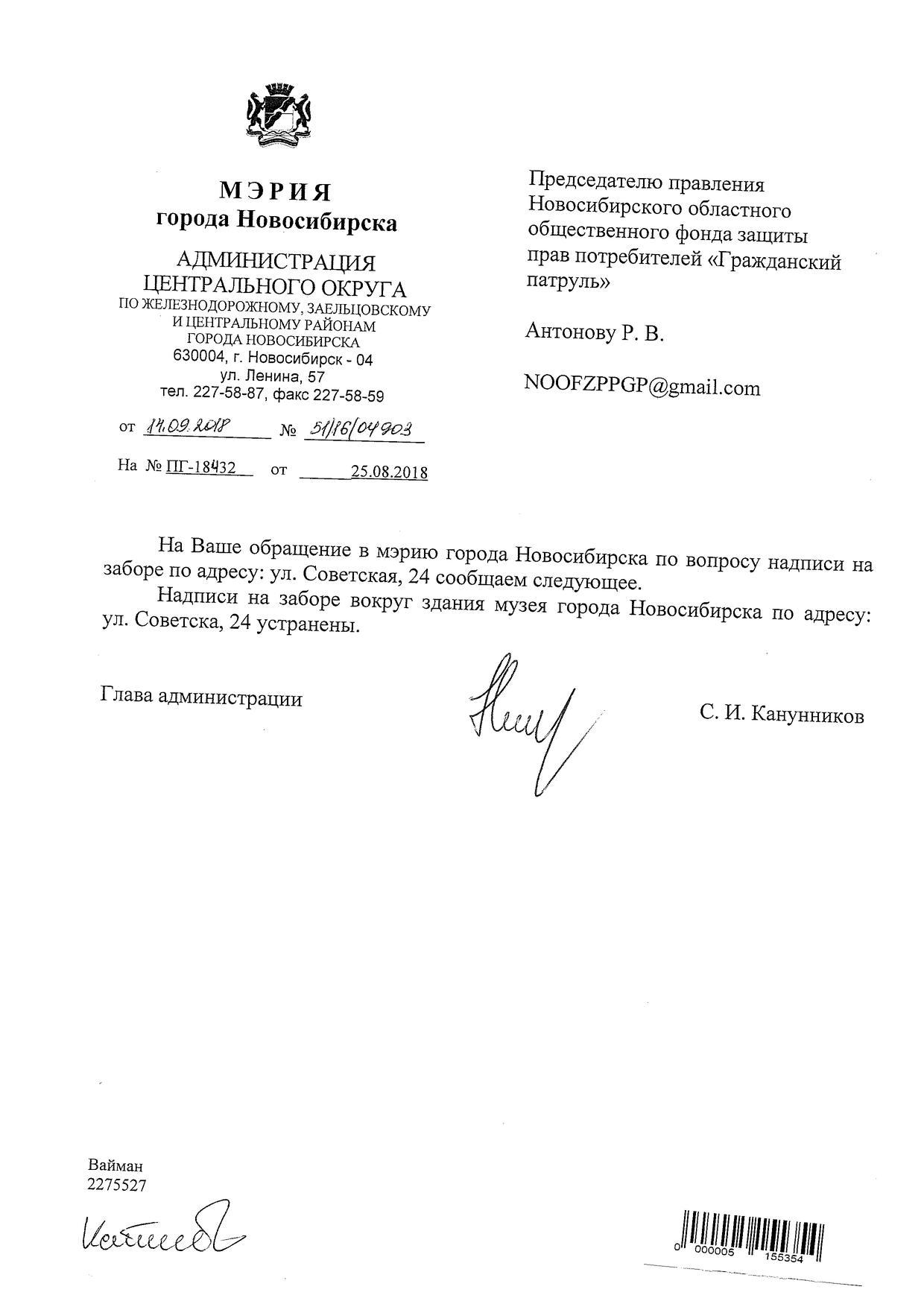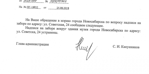 Номер жалобы:40317 Тип жалобы:Иные проблемы ЖКХ Название объекта:Управляющий Компания Регион:Новосибирская область Город:Новосибирск Адрес:ул. Советская, 24 Описание жалобы:Надписи на фасаде забора Статус: