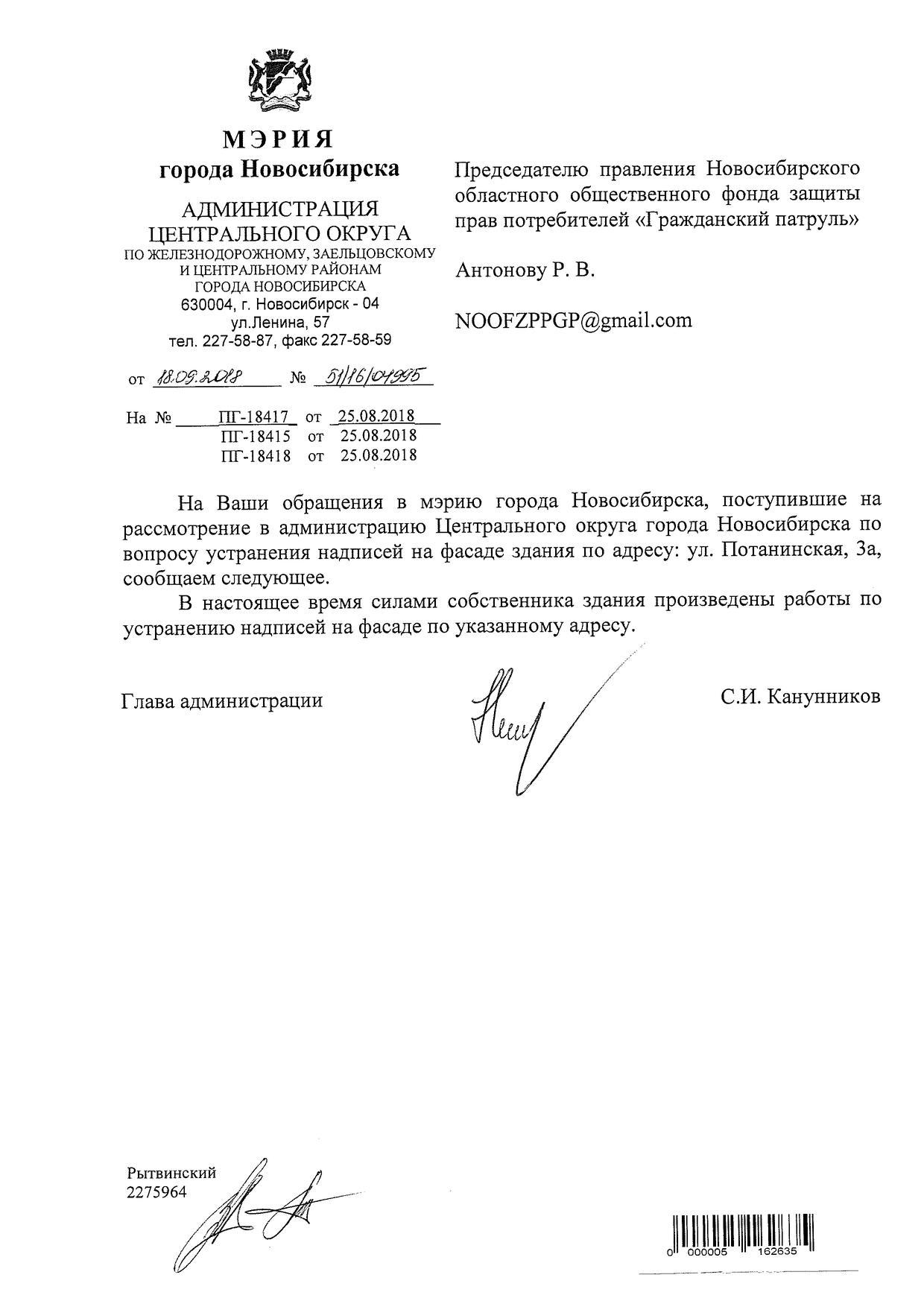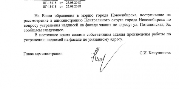 Номер жалобы:40325 Тип жалобы:Иные проблемы ЖКХ Название объекта:Управляющая Компания Регион:Новосибирская область Город:Новосибирск Адрес:Потанинская ул., 3А Описание жалобы:Надписи на фасаде Статус: