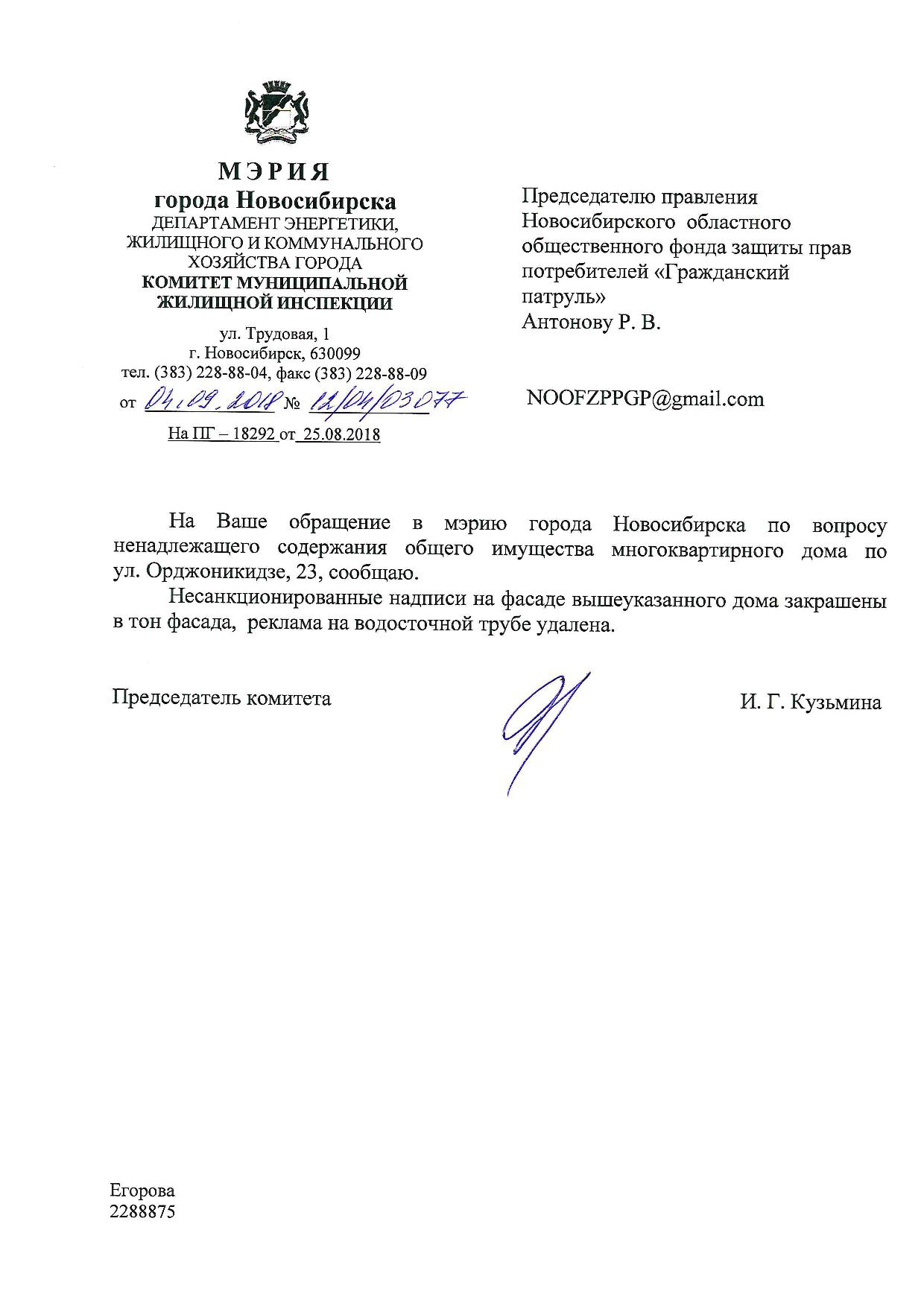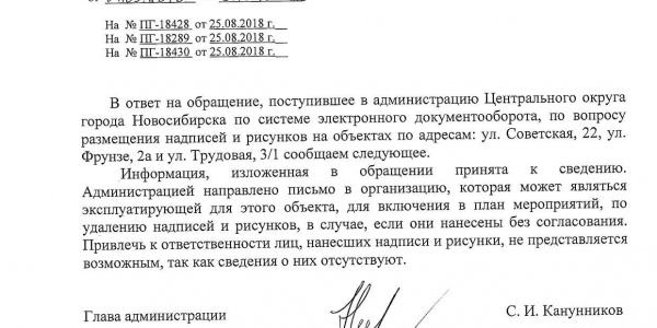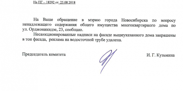 Номер жалобы:40316 Тип жалобы:Иные проблемы ЖКХ Название объекта:Управляющий Компания Регион:Новосибирская область Город:Новосибирск Адрес:ул. Советская, 22А Описание жалобы:Надписи на фасаде дома Статус: