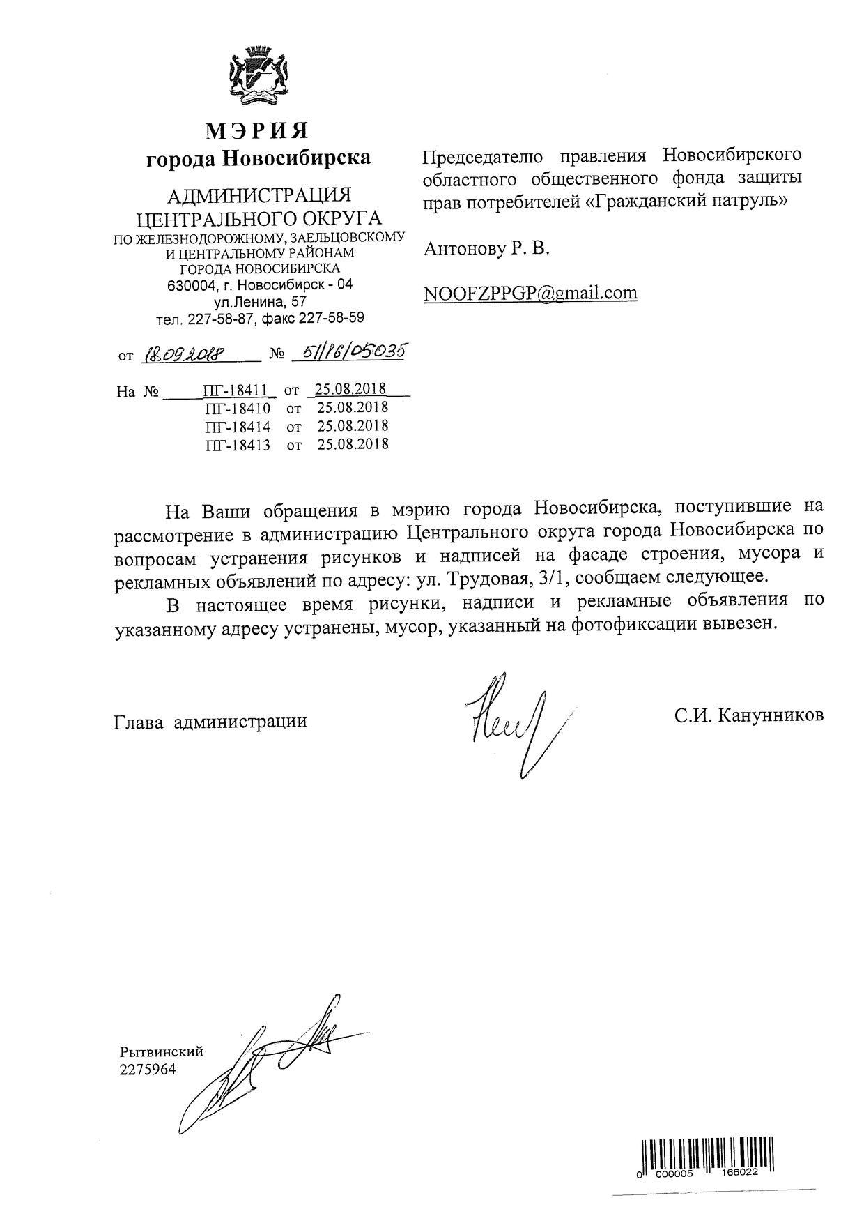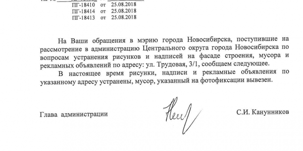 Номер жалобы:40313 Тип жалобы:Иные проблемы ЖКХ Название объекта:Управляющая Компания Регион:Новосибирская область Город:Новосибирск Адрес:Трудовая ул., 3/1 Описание жалобы:Объявления на фасаде хоз.корпуса Статус: