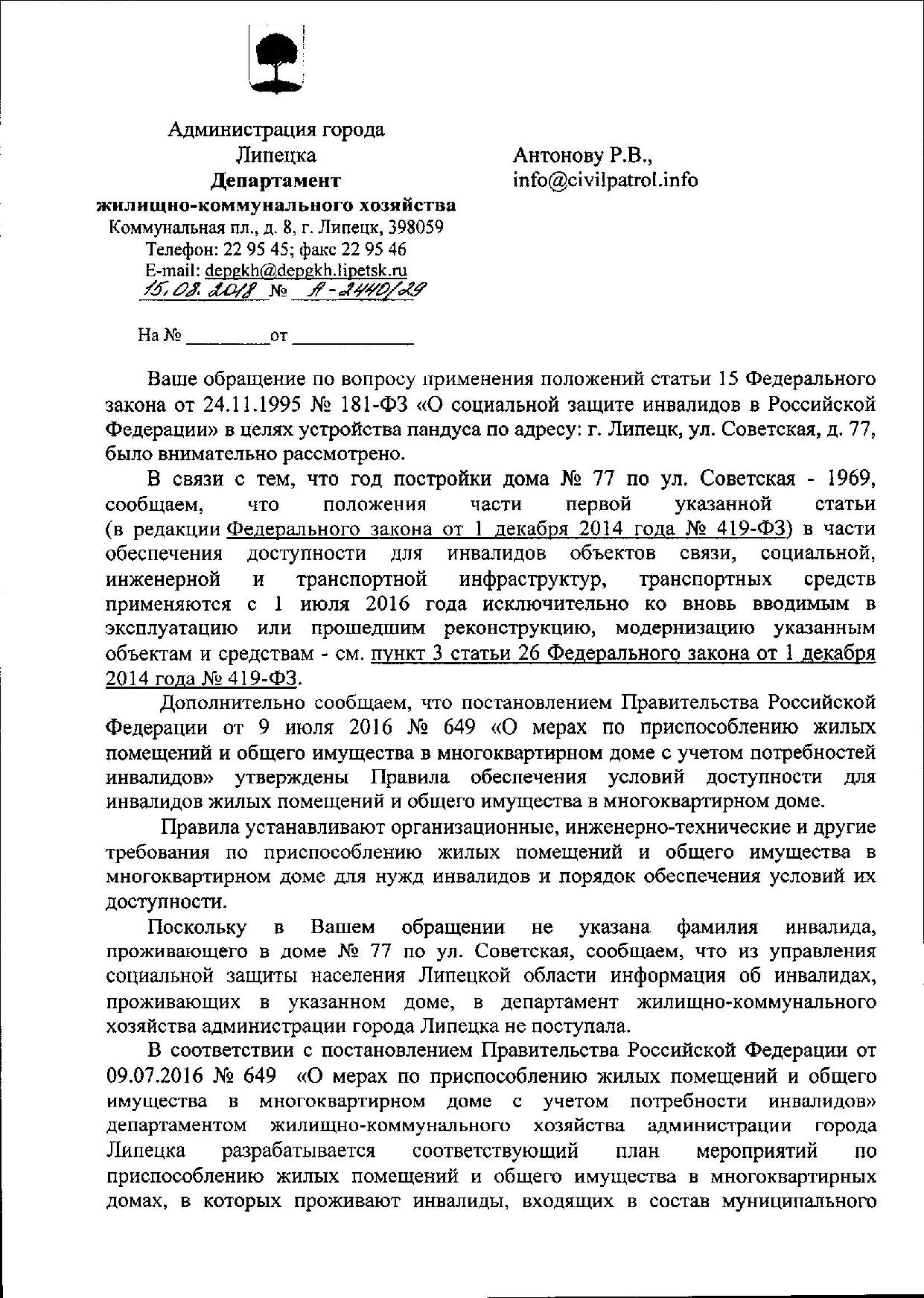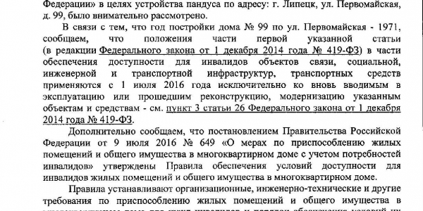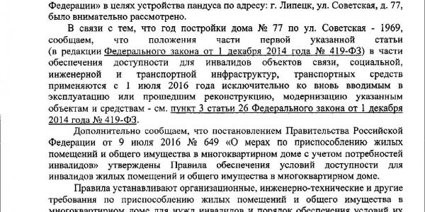 Номер жалобы:39609 Тип жалобы:Иные проблемы ЖКХ Название объекта:Ук Регион:Липецкая область Город:Липецк Адрес:ул. Советская, 77 Описание жалобы:Нет пандуса для инвалидов у подьездов, надписи на фасаде Статус:
