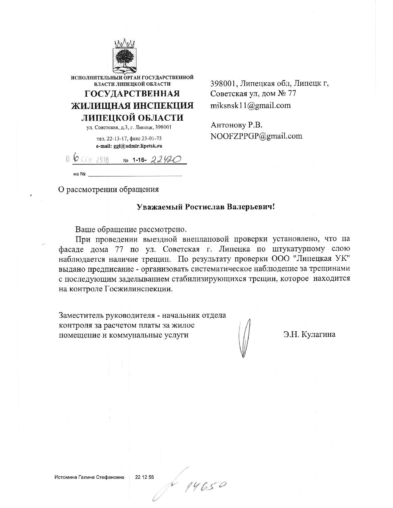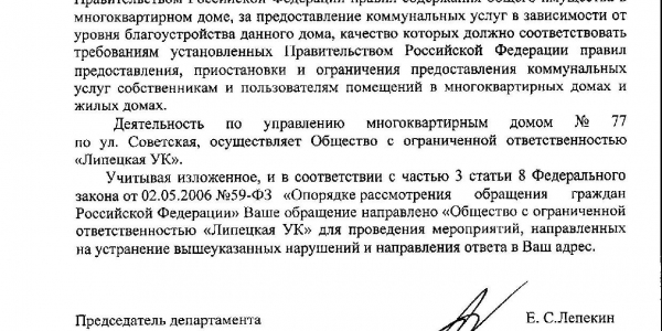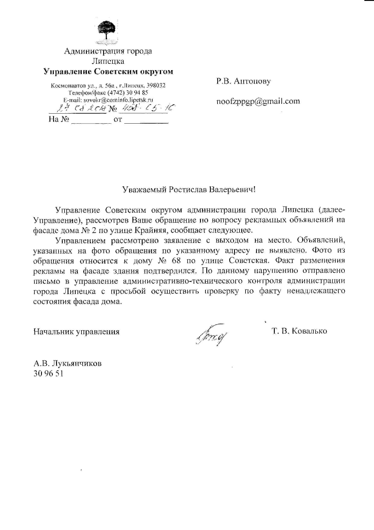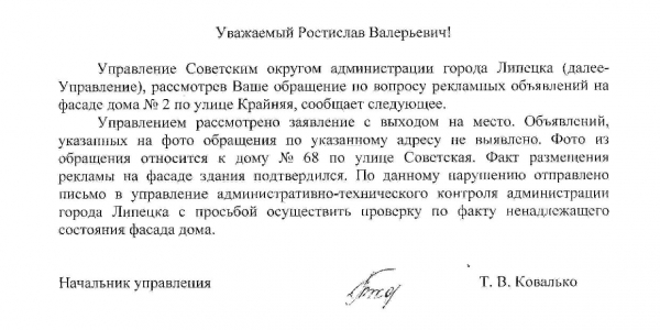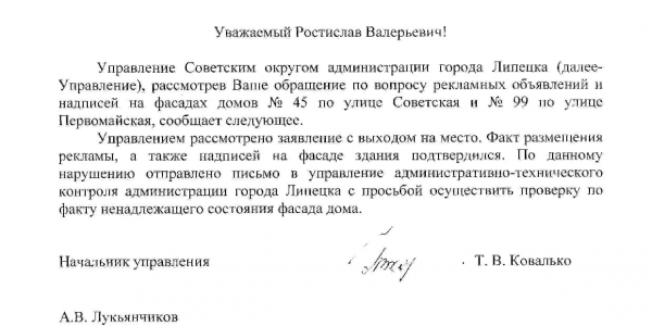 Номер жалобы:39606 Тип жалобы:Иные проблемы ЖКХ Название объекта:Ук Регион:Липецкая область Город:Липецк Адрес:ул. Советская, 71 Описание жалобы:Объявления Статус: