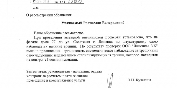 Номер жалобы:39608 Тип жалобы:Иные проблемы ЖКХ Название объекта:Ук Регион:Липецкая область Город:Липецк Адрес:ул. Советская, 77 Описание жалобы:Опасное разрушение фасада Статус: