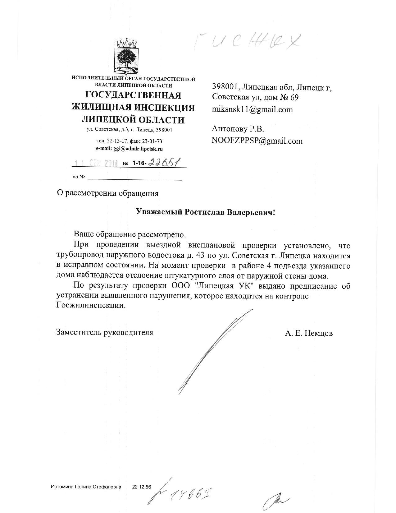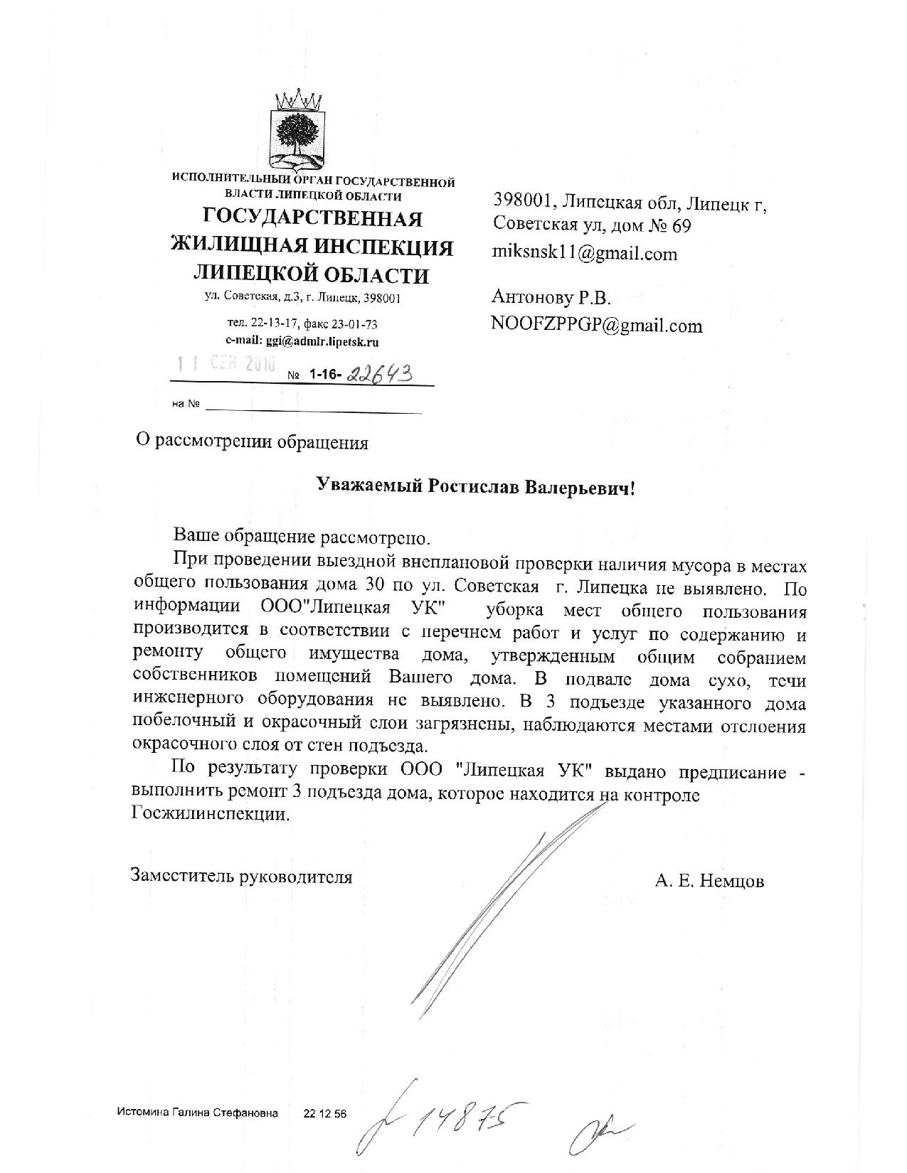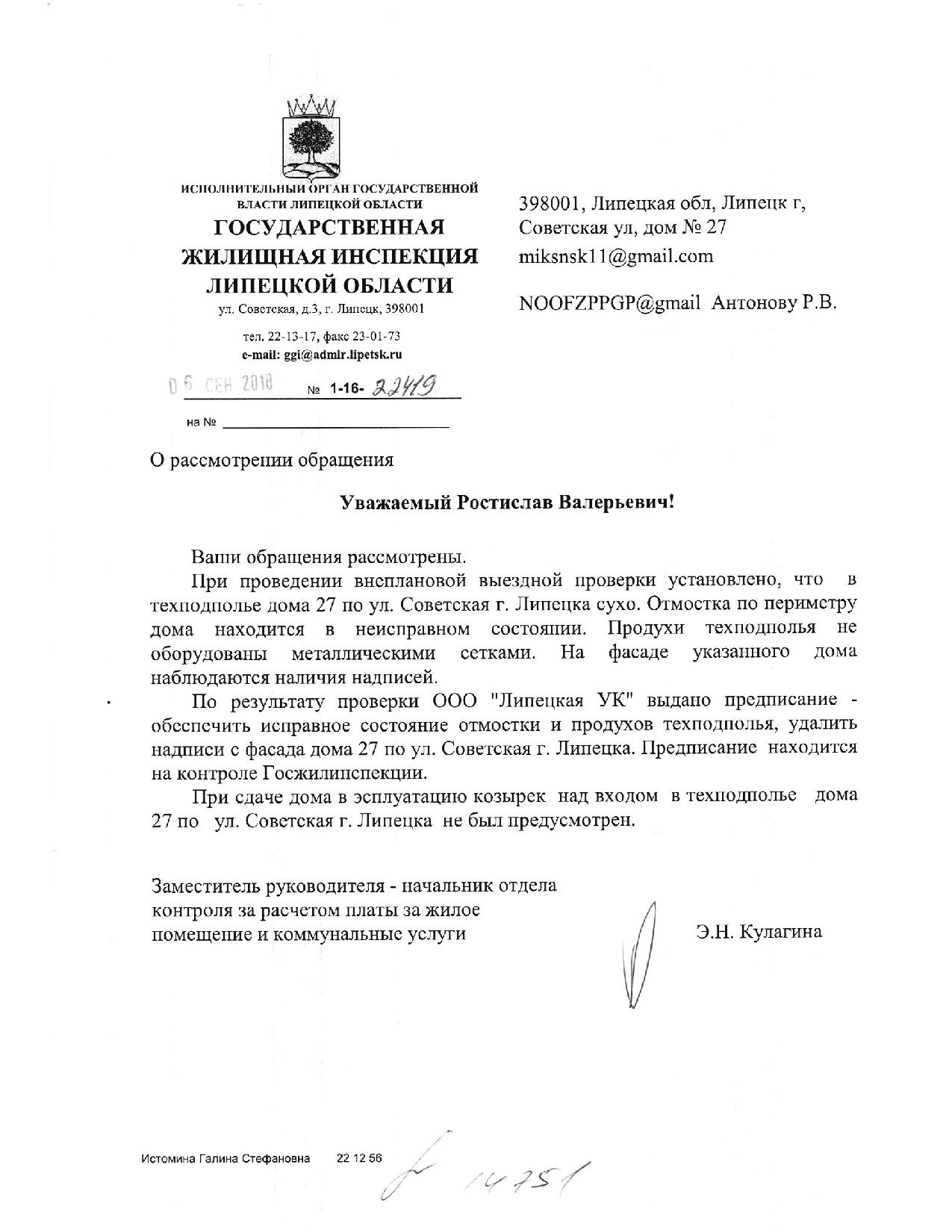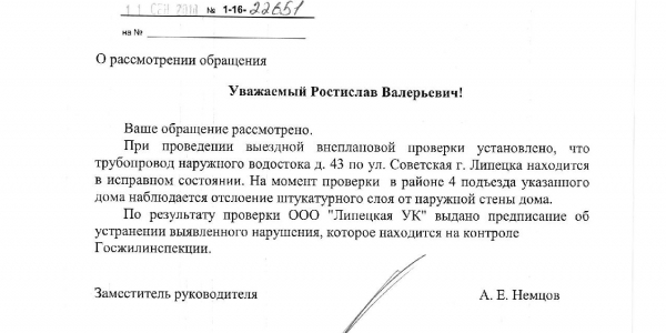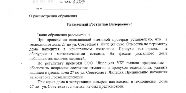 Номер жалобы:39587 Тип жалобы:Иные проблемы ЖКХ Название объекта:Ук Регион:Липецкая область Город:Липецк Адрес:ул. Советская, 26 Описание жалобы:Надписи на фасаде Статус: