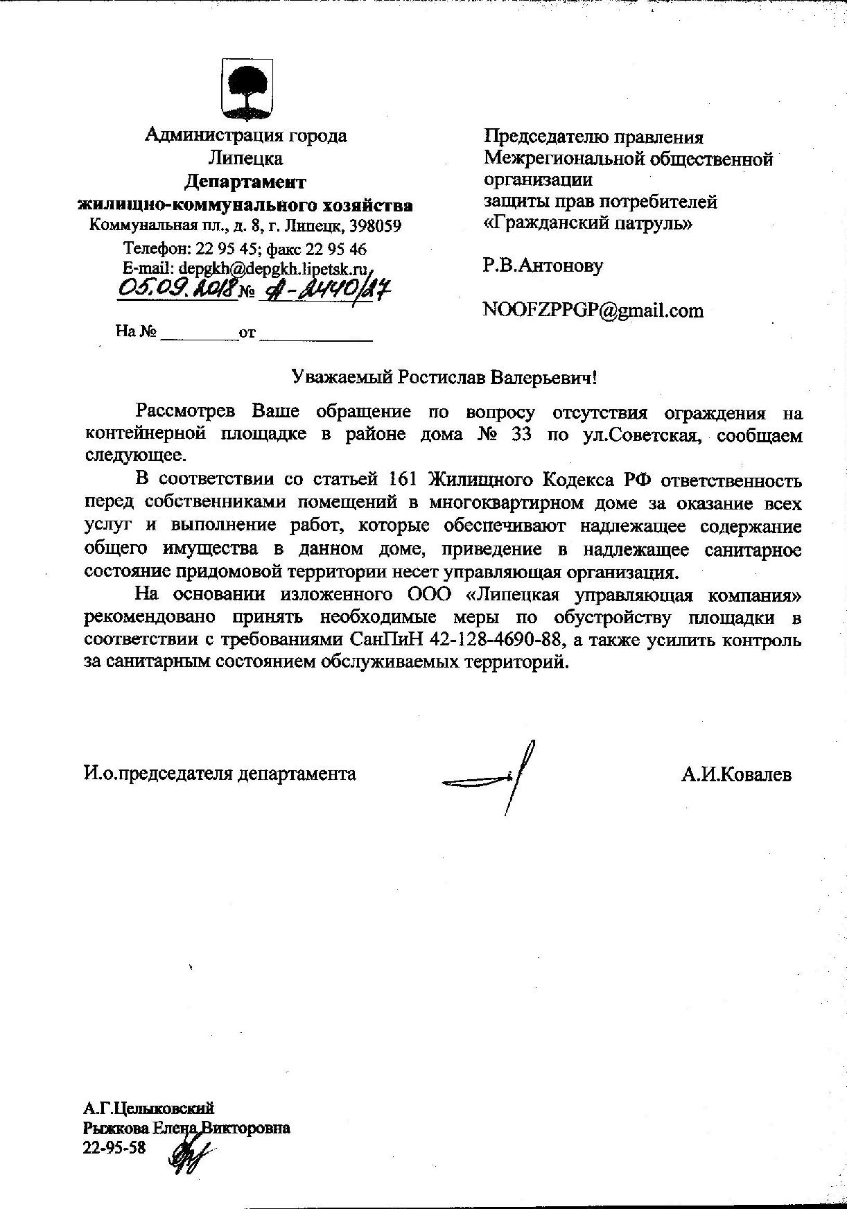 Номер жалобы:39583 Тип жалобы:Иные проблемы ЖКХ Название объекта:Ук Регион:Липецкая область Город:Липецк Адрес:ул. Советская, 29 Описание жалобы:Нет крыши над входом в подвальное помещение. Скапливаются осадки. Надписи Статус: