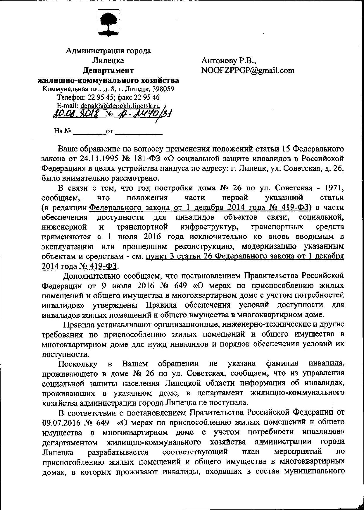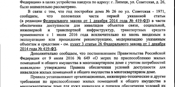 Номер жалобы:39588 Тип жалобы:Иные проблемы ЖКХ Название объекта:Ук Регион:Липецкая область Город:Липецк Адрес:ул. Советская, 26 Описание жалобы:Нет пандуса для инвалидов на входе в подъезд и лестнице Статус: