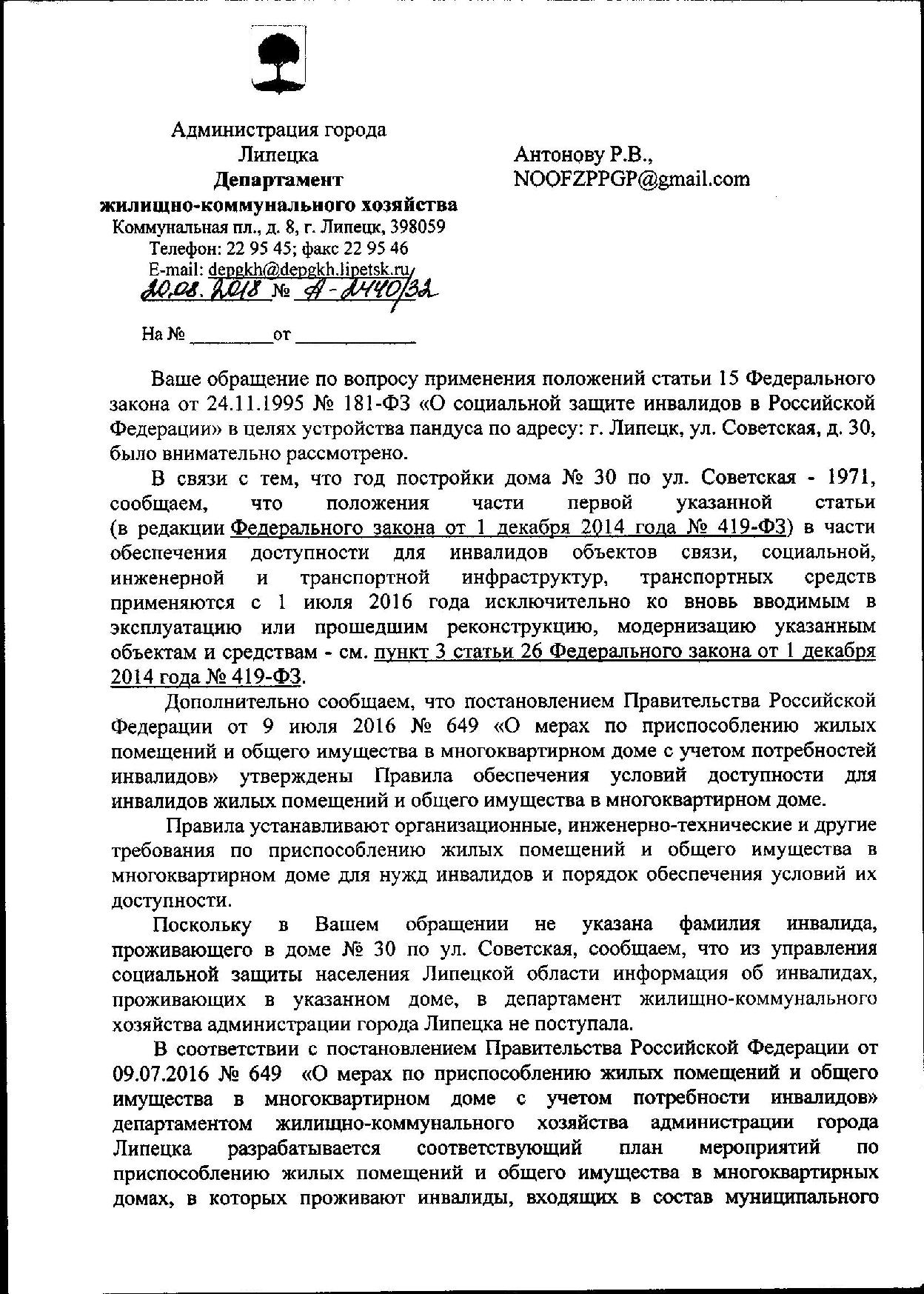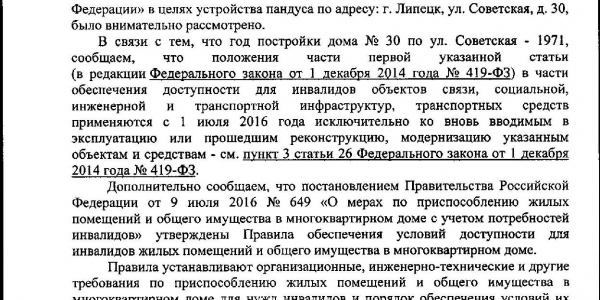 Номер жалобы:39589 Тип жалобы:Иные проблемы ЖКХ Название объекта:Ук Регион:Липецкая область Город:Липецк Адрес:ул. Советская, 30 Описание жалобы:Нет пандуса для инвалидов на входе в подъезд и лестнице Статус: