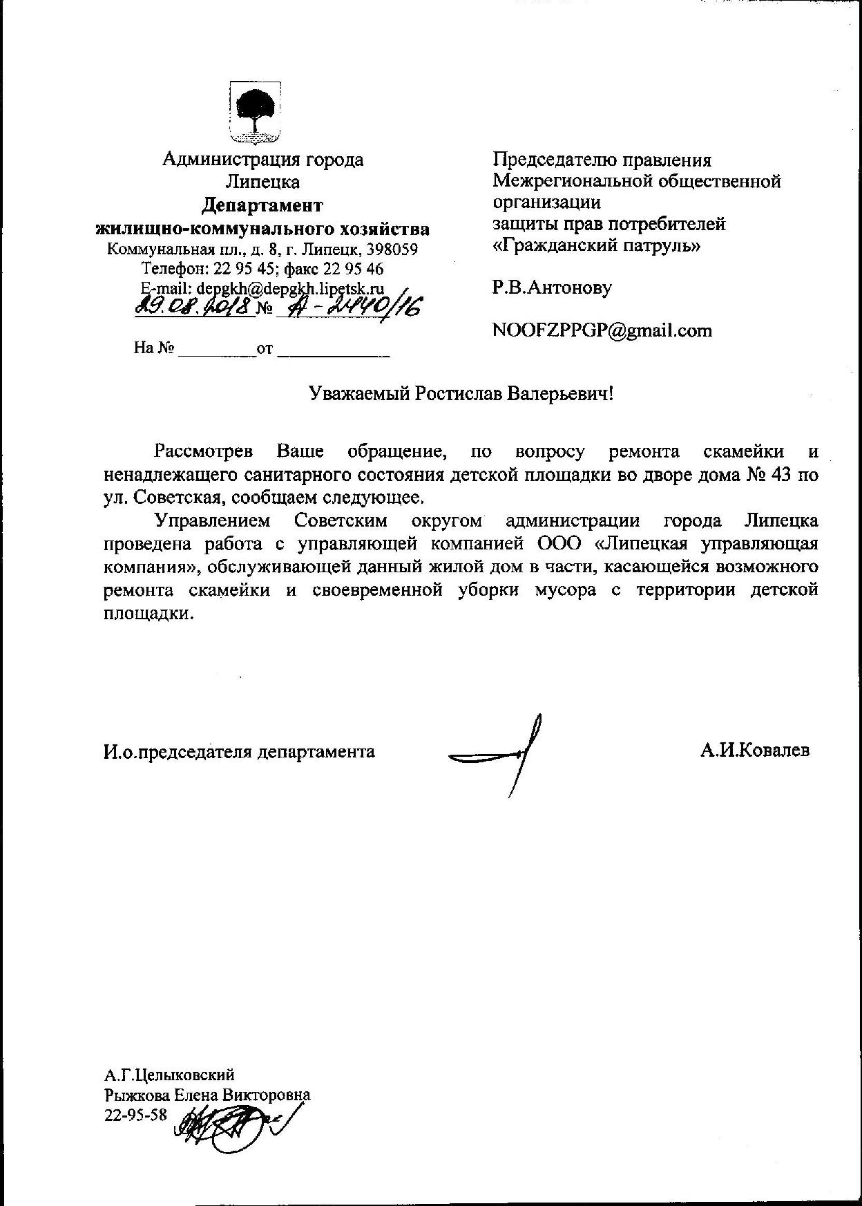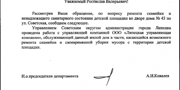 Номер жалобы:39593 Тип жалобы:Иные проблемы ЖКХ Название объекта:Ук Регион:Липецкая область Город:Липецк Адрес:ул. Советская, 43 Описание жалобы:Сломана лавочка на детской площадке. Мусор Статус: