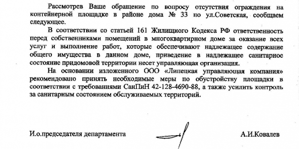 Номер жалобы:39584 Тип жалобы:Иные проблемы ЖКХ Название объекта:Ук Регион:Липецкая область Город:Липецк Адрес:ул. Советская, 33 Описание жалобы:Не оборудована площадка для сбора и вывоза бытовых отходов Статус: