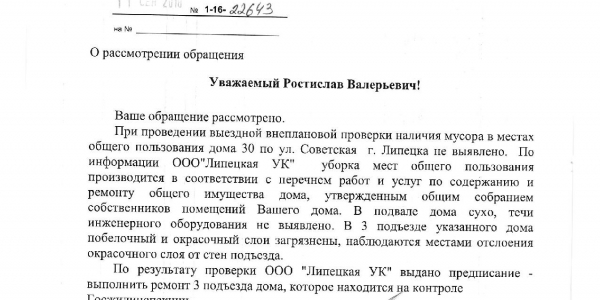 Номер жалобы:39591 Тип жалобы:Иные проблемы ЖКХ Название объекта:Ук Регион:Липецкая область Город:Липецк Адрес:ул. Советская, 30 Описание жалобы:Подъезд не убирается, запах и давно не было ремонта Статус: