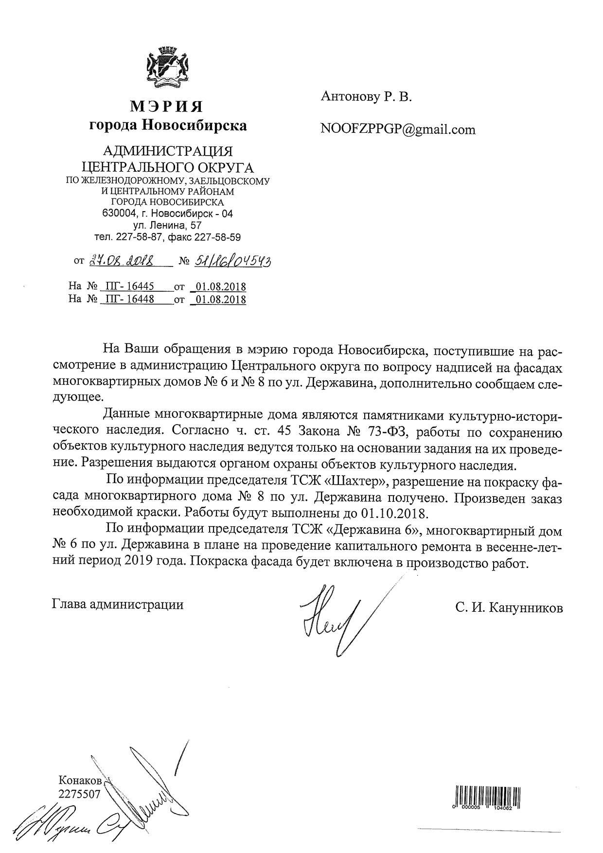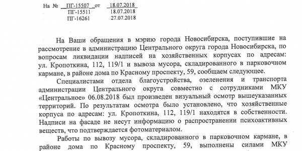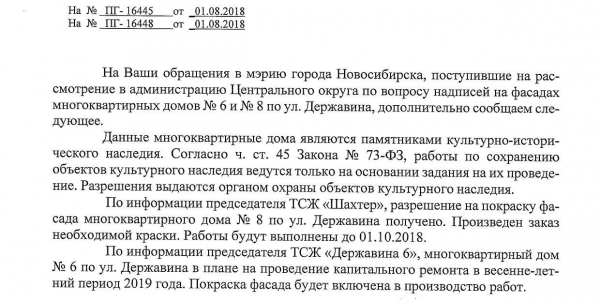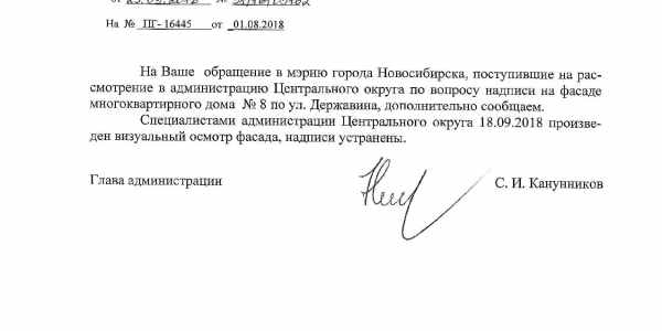 Номер жалобы:39345 Тип жалобы:Иные проблемы ЖКХ Название объекта:Ук Регион:Новосибирская область Город:Новосибирск Адрес:ул. Державина, 6 Описание жалобы:Надписи на фасаде Статус: