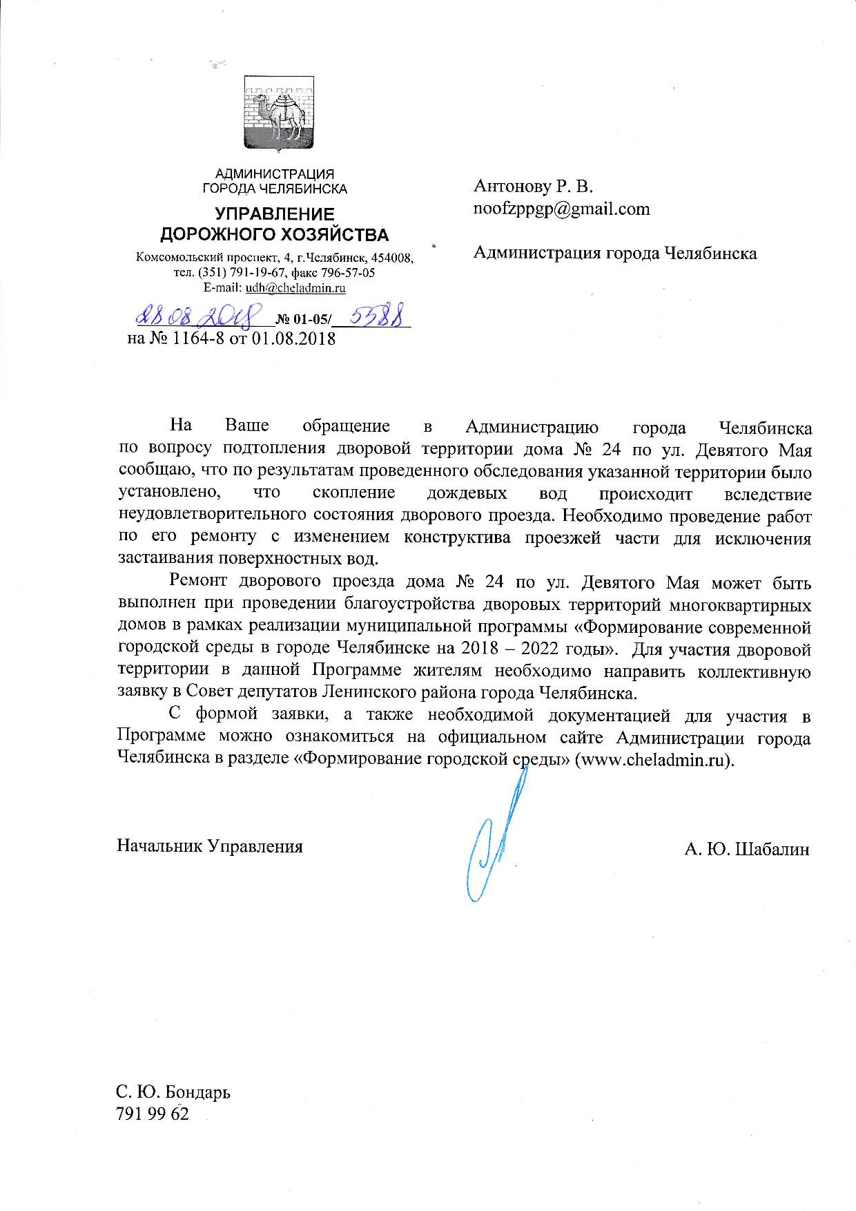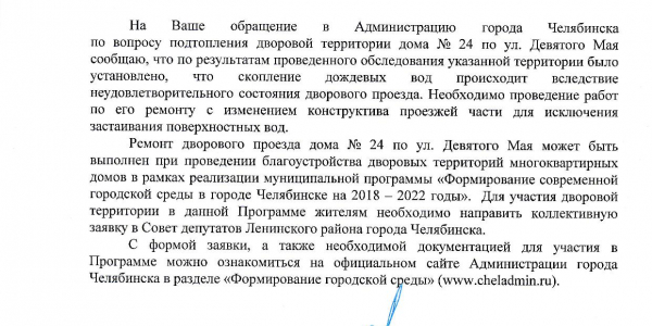 Номер жалобы:39375 Тип жалобы:Иные проблемы ЖКХ Название объекта:ООО УК-1 «Южуралстройсервис» Регион:Челябинская область Город:Челябинск Адрес:улица 9 Мая, 24 Описание жалобы:Нет водоотвода, весной во время таяния либо во время интенсивных дождей летом, образуется большая лужа (точнее даже вся вода стекает туда). Тем самым перекрывая проход в 3, 4 подъезды.