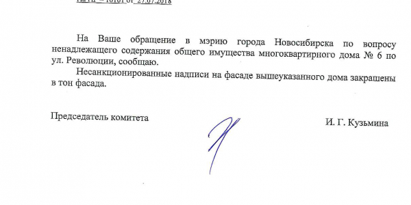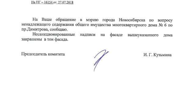 Номер жалобы:39243 Тип жалобы:Иные проблемы ЖКХ Название объекта:Управляющая Компания Регион:Новосибирская область Город:Новосибирск Адрес:пр. Димитрова, 6 Описание жалобы:Надписи на фасаде дома Статус: