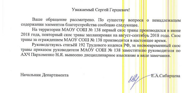 Номер жалобы:39261 Тип жалобы:Иные проблемы ЖКХ Название объекта:Коробова С Регион:Свердловская область Город:Екатеринбург Адрес:пр. Космонавтов, 76А Описание жалобы:Добрый день, поражает как косят траву у нас в городе....не...я не про центр, а как обычно о наболевшем, Эльмаш. Около забора садика и входа в школу 138 со стороны Проспект Космонавтов растет трава репейрик. Никому до него дела нет, он выше человеческого роста ... администрация ведать тут не ходят. С другой стороны садиков где стоянка авто из года в год одно и тоже трава растет а дела нет никому. Прошу обратить внимание властей. Спасибо Статус: