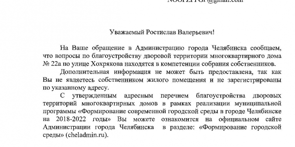 Номер жалобы:39339 Тип жалобы:Иные проблемы ЖКХ Название объекта:Не Знаю Регион:Челябинская область Город:Челябинск Адрес:ул. Хохрякова, 22А Описание жалобы:Во время дождевых осадков размывает открытый земельный грунт. Автомобили , которые паркуются на данном месте образуют ужасную грязь и огромное нарушение инфраструктуры Статус: