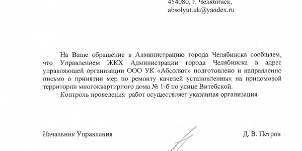Номер жалобы:39403 Тип жалобы:Иные проблемы ЖКХ Название объекта:Администрация Челябинска Регион:Челябинская область Город:Челябинск Адрес:ул. Витебская, 1Б Описание жалобы:Это что, инструмент естественного отбора? Приведите качели в порядок, пока дети не содрали себе ноги Статус: