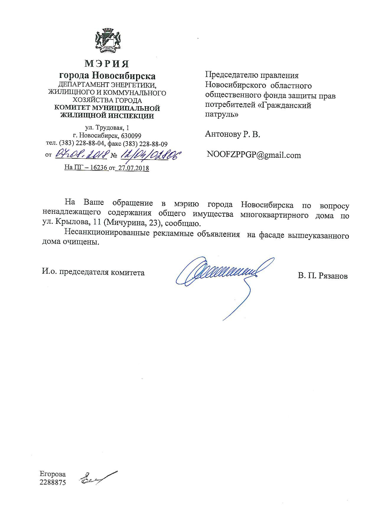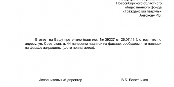 Номер жалобы:39216 Тип жалобы:Иные проблемы ЖКХ Название объекта:Управляющая Компания Регион:Новосибирская область Город:Новосибирск Адрес:Красный пр., 45 Описание жалобы:Надписи на фасаде дома Статус: