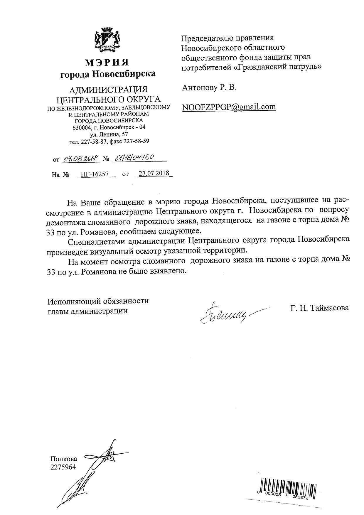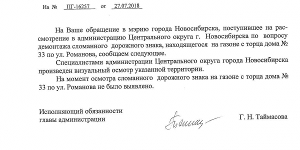 Номер жалобы:39219 Тип жалобы:Иные проблемы ЖКХ Название объекта:Управляющая Компания Регион:Новосибирская область Город:Новосибирск Адрес:ул. Романова, 33 Описание жалобы:Сломанный знак лежит на газоне с торца дома Статус: